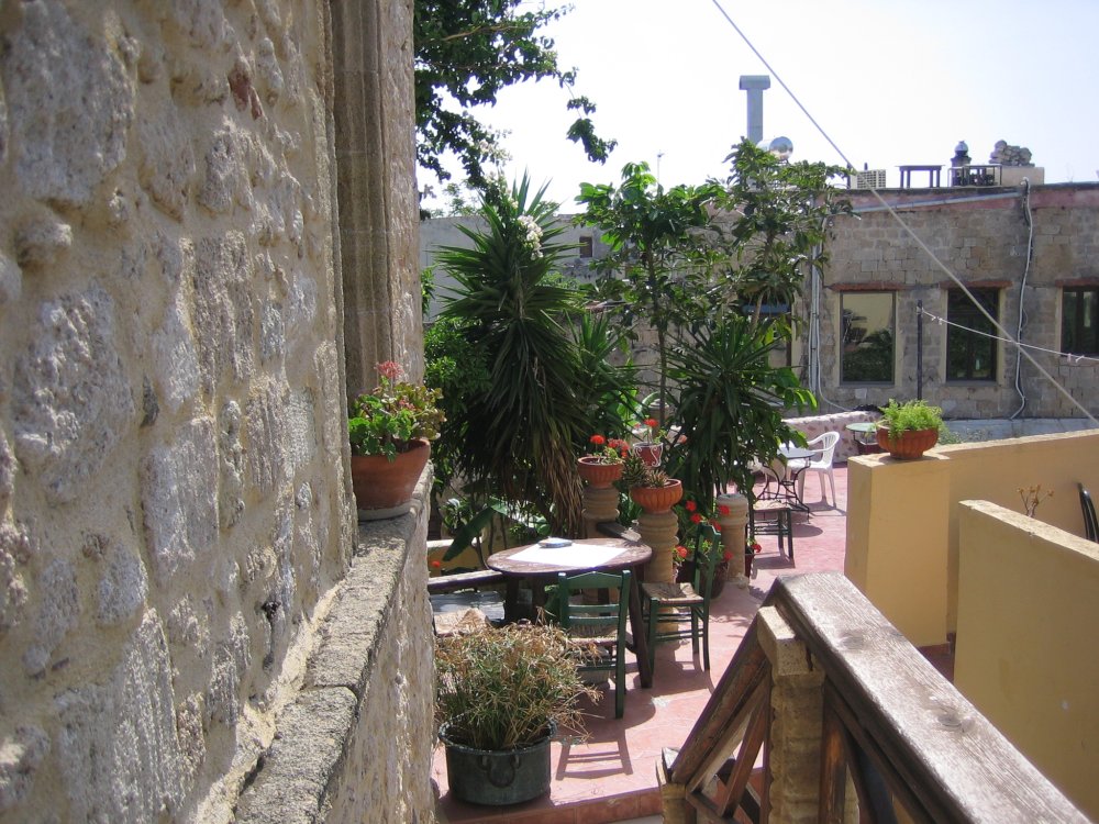 Hinter der weißen Mauer (links) ist eine wunderschöne Veranda, wo wir frühstückten und auch tagsüber mit einem Ouzo und einem guten Buch abhängen konnten.