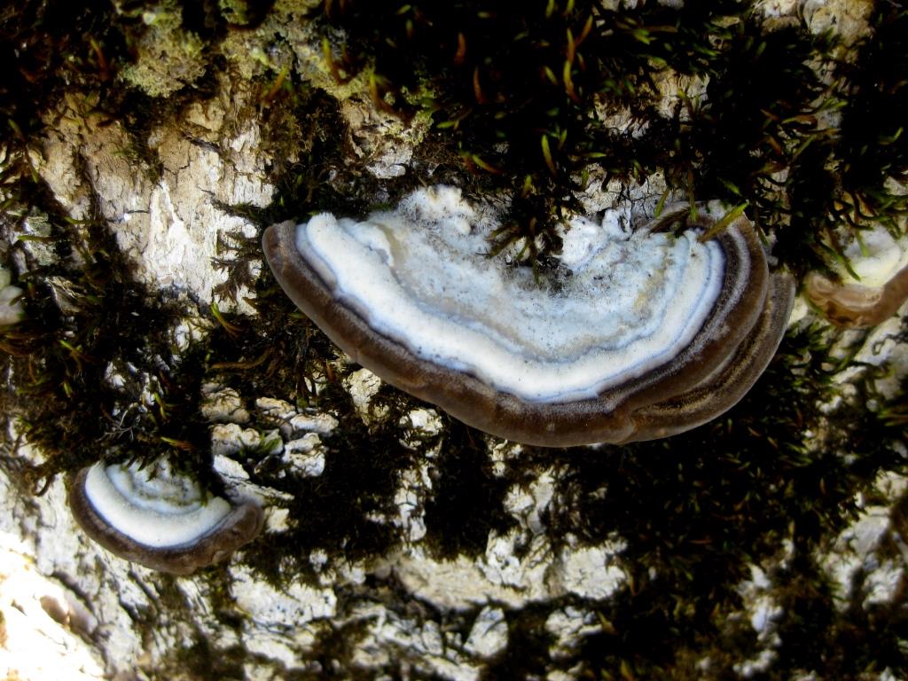 mich erinnert das von der Struktur der Fruchtkörper her an die Striegelige Tramete (Trametes hirsuta). Bild 1 halte ich für etwas farbverfälscht und Bild 2 für vertrauenswürdiger, was das angeht. Dort sieht man hellblau-gräuliche Streifen, die ich durchaus zur Variationsbreite der Art zählen würde.