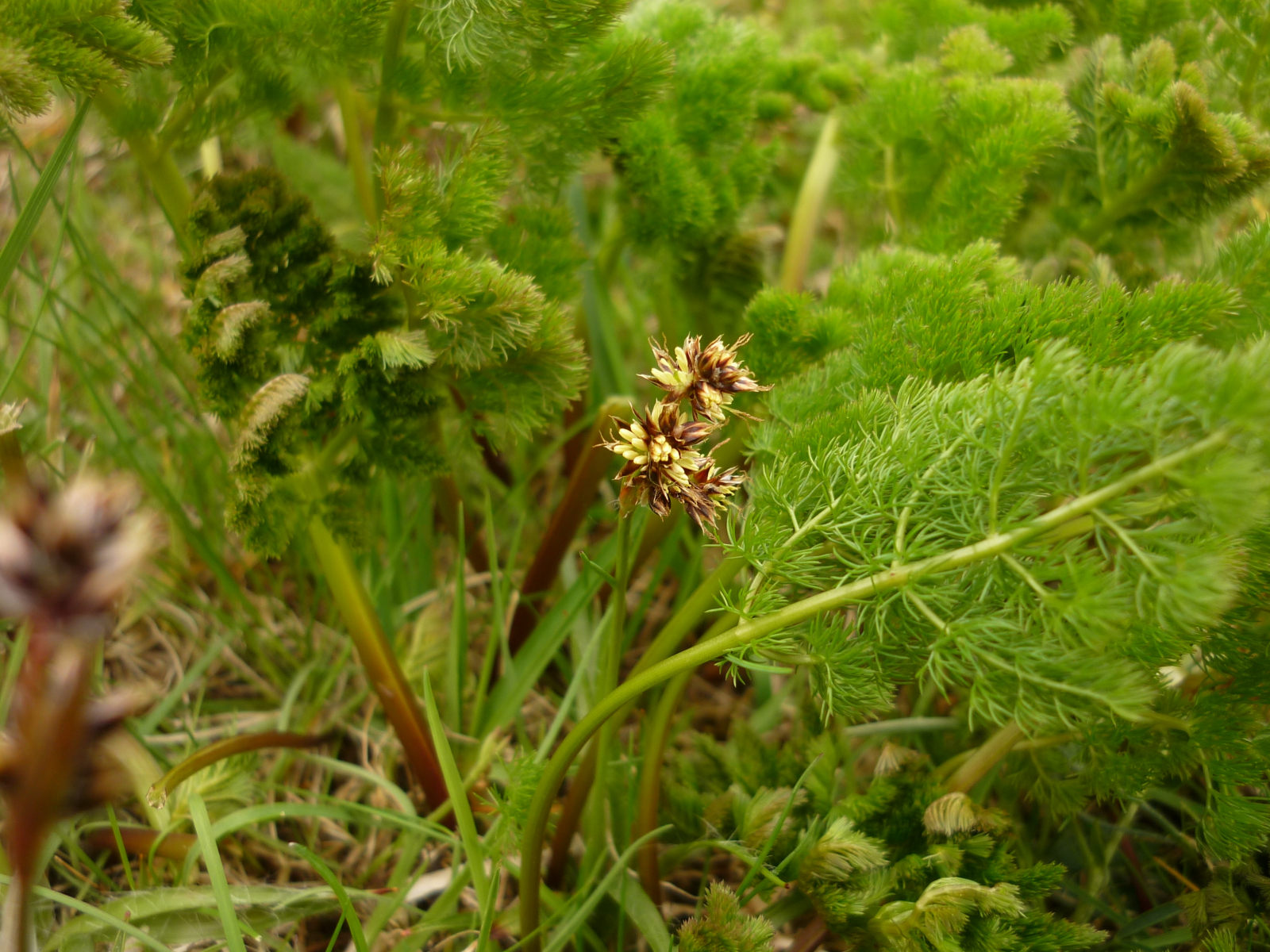 Und wenn sich die Blüten auch noch zurückhalten, wachsen hier inzwischen immerhin die ersten Kräutlein, wie die hübsche Bärwurz. Sie sieht dem Dillkraut ähnlich und schmeckt wie Petersilie mit einer leichten Liebstöcklnote. Verdammt lecker. Die Blüte gehört nicht dazu, da hat sich ein Gras ins Foto geschummelt.