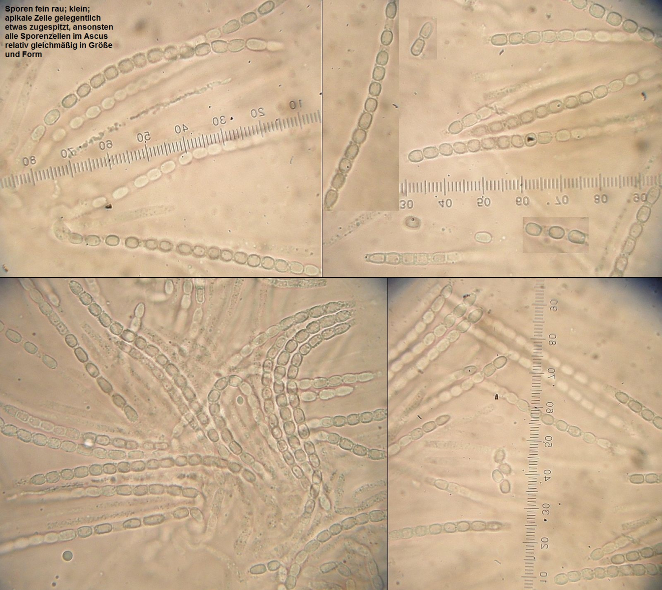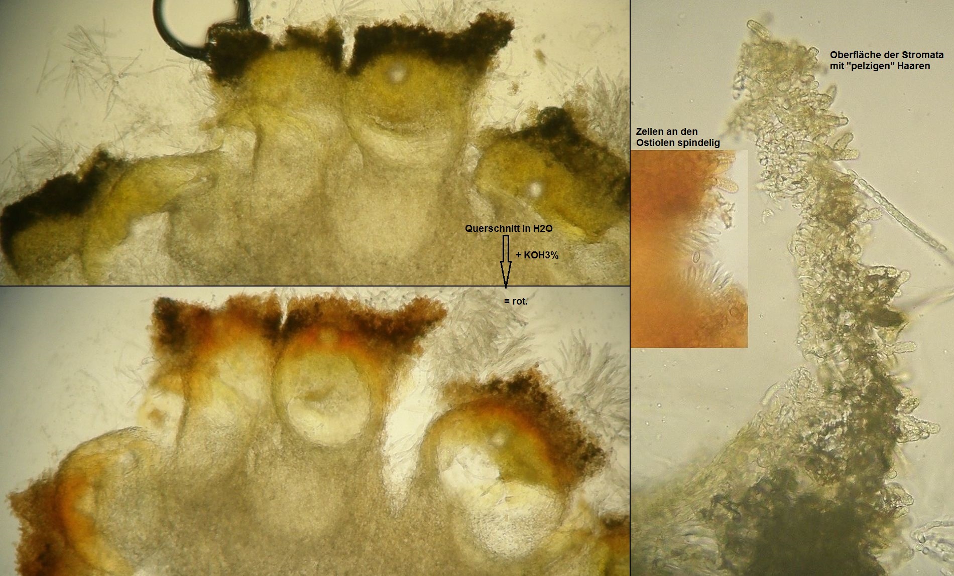 KOH –“ Reaktion deutlich orangerot; Oberfläche der Stromata mit hyalinen, rauen Haaren; Ostiolen (–žPerithecienmündungen–œ) mit spindeligen bis lanzettlichen, aber auf jeden Fall apikal zugespitzten Zellen; Asci 16-sporig; Sporen fein rauh; innerhalb eines Ascus ziemlich einheitlich in Form und Größe, meist nur distale und proximale Zelle minimal abweichend; Vitalmaße in Leitungswasser ca. 3,5-4,5 x 2,5-3,5 µm.