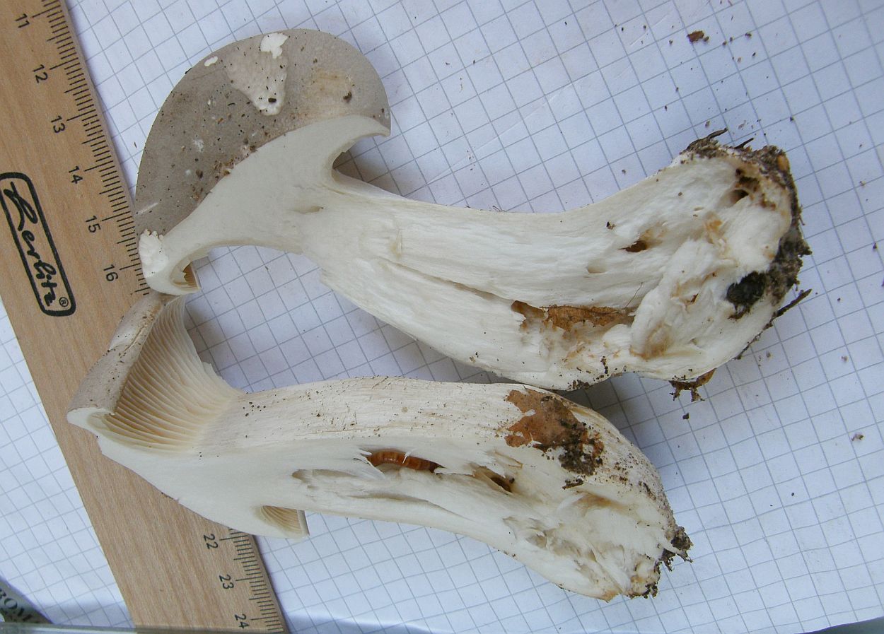 Clitocybe geotropa (Mönchskopf) gehört in die Gruppe von nicht - hygrophanen Trichterlingen mit kugeligen bis tränenförmigen Sporen. Die sehen wirklich absolut anders aus (hatte ich sogar schon unterm Mikro). Den kann ich aber auch makroskopisch ausschließen, denn die Fleischkonsistenz ist deutlich anders, auch die Hutfarben hatte ich beim Mönchskopf noch nie mit solchem Grauanteil.