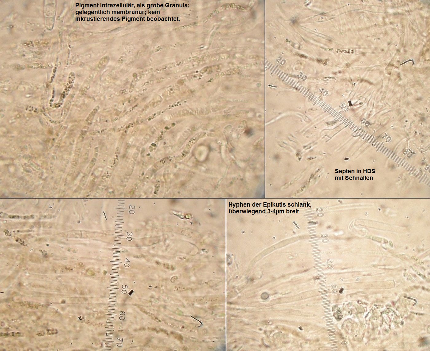 Also guckt man mal durch, was es noch so gibt: Die Nachbarart zu Clitocybe nebularis wäre Clitocybe alexandri (Buchsblättriger Trichterling). Da passt einiges, aber eben nicht alles. So sollten sich zB inkrustierte Hyphen in der HDS finden, aber ich finde keine. Das Pigment ist teils intrazellulär, auch hier und da wohl membranär. Dafür sind die Hyphen der Epikutis durchgehen schmal, da ist nichts über 4 µm zu sehen (bei C. nebularis sollten sie breiter sein?).