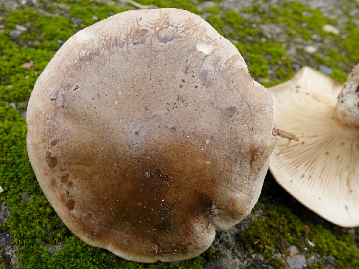 Huthaut eher glatt (nach Regen) mit konzentrischen Tropfen am Rand wie Lepista gilva (aber der ist ja schmächtiger ? und anders in der Farbe, nicht so fahl-dunkelbraun... jedenfalls meine Funde der Art.), Hutfarbe fahles Mittel- bis Dunkelbraun, am Rand heller