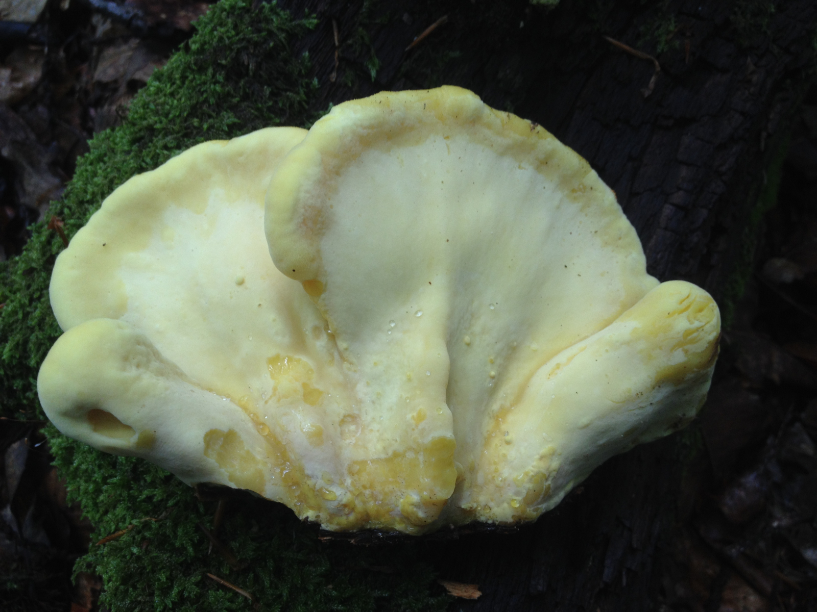 • Hallo heute gings mal wieder in den Wald, neben ein paar Maiporlingen fand ich diesen Schwefelporling, bin mir jetzt aber gar nicht mehr sicher ob's wirklich einer ist, oderob ich da den leuchtenden Weichporling gefunden habe.