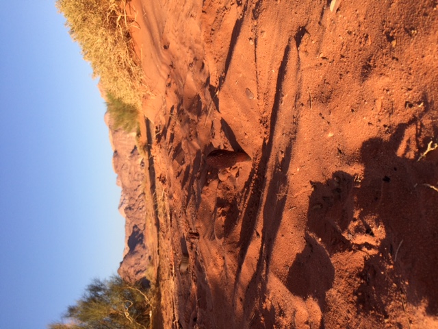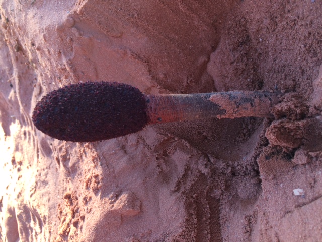 ein guter Bekannter, der neulich Jordanien bereist und dort im Wadi Ram Station gemacht hat, machte dort einen bemerkenswerten Pilzfund. Ihm fiel auf einer Jeep-Safari durch den Wüstensand ein etwa 15 cm aus dem Sand ragendes hohes Gebilde auf. Ein dezentes Schnuppern ergab schwachen Aasgeruch, es musste sich also um eine Stinkmorchel im weitesten Sinne handeln. Der Bekannte legte durch Graben im Sand einen ca. 20 cm langen porösen Stiel frei, kam aber nicht bis zur Basis hinunter und konnte so die Hautlappen eines eventuell vorhandenen Hexeneirestes nicht untersuchen. Auf dem dritten Bild sieht man links vorne in der Sandgruppe noch zwei weitere kleine, noch nicht so weit entwickelte Fruchtkörper. Jetzt die Frage: weiß jemand, um welche zweifellos sehr markante Art es sich hier handeln könnte?