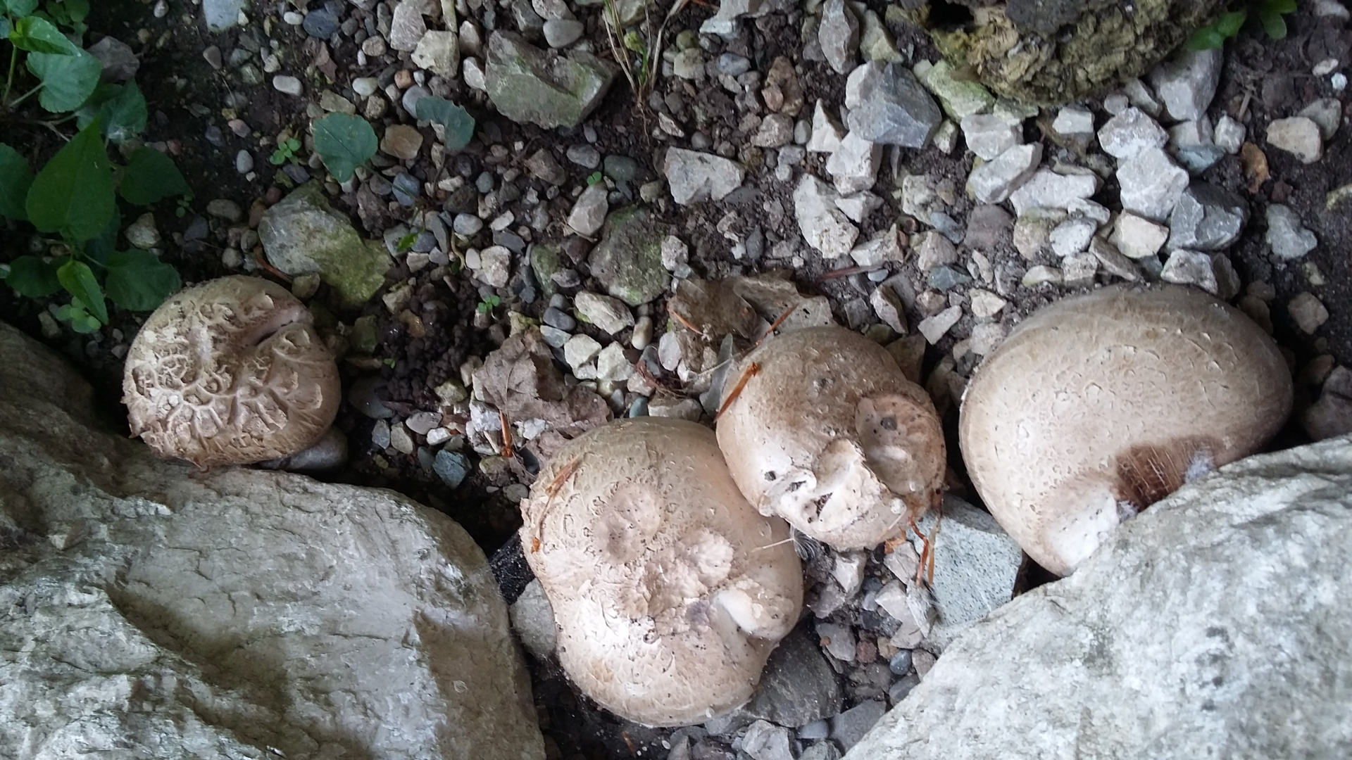 2. unter dem großen Pilz auf dem Kies war noch ein kleiner verborgen, diese mit glattem graubraunem Hut