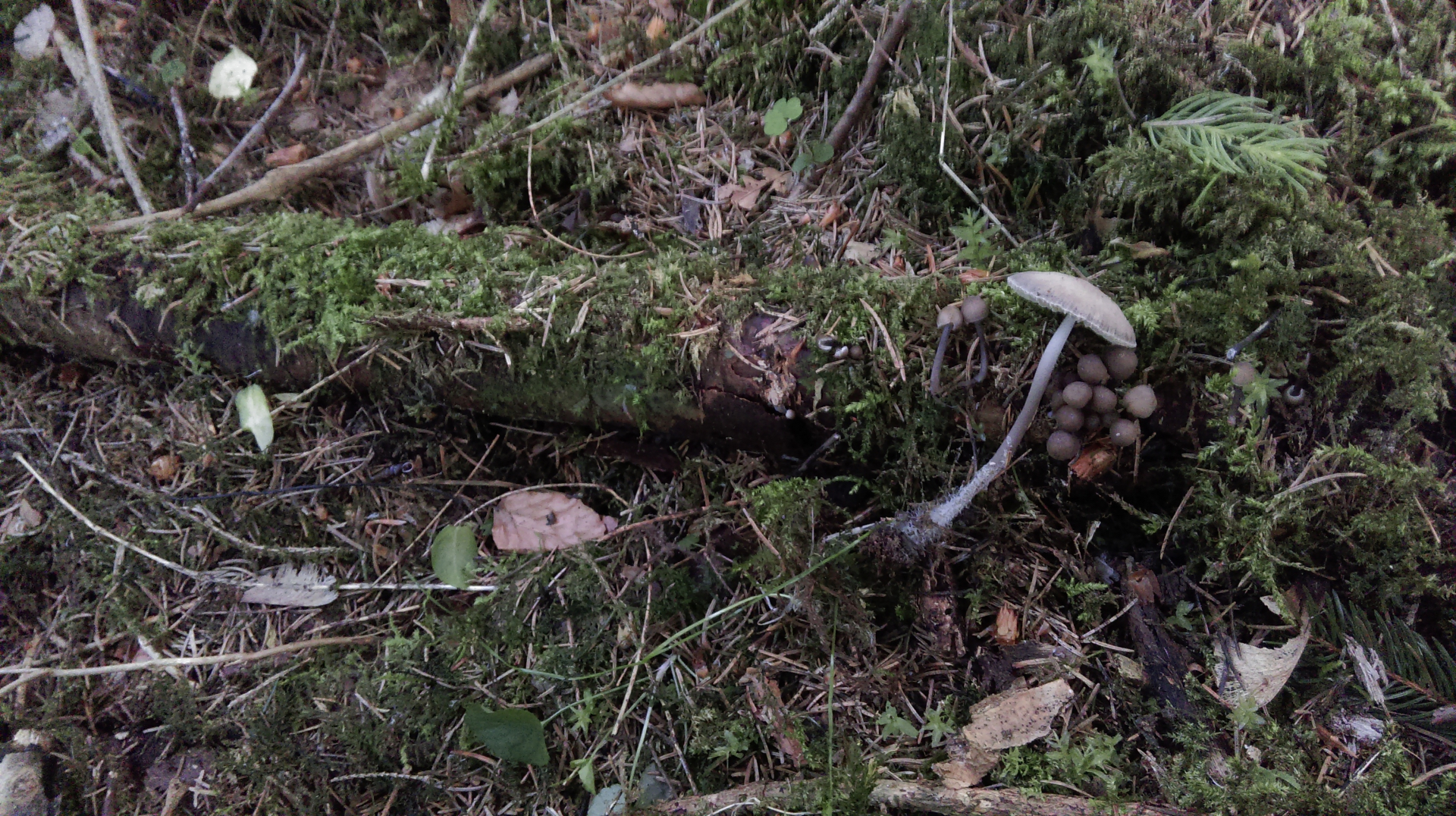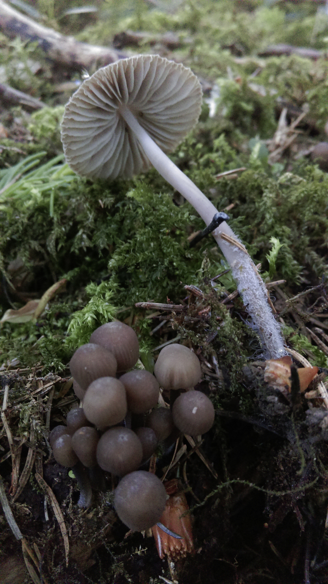 Der große Pilz hat einen Hutdurchmesser von 3,5cm, die kleinen daneben nur 0,8cm - gehören die überhaupt zusammen?