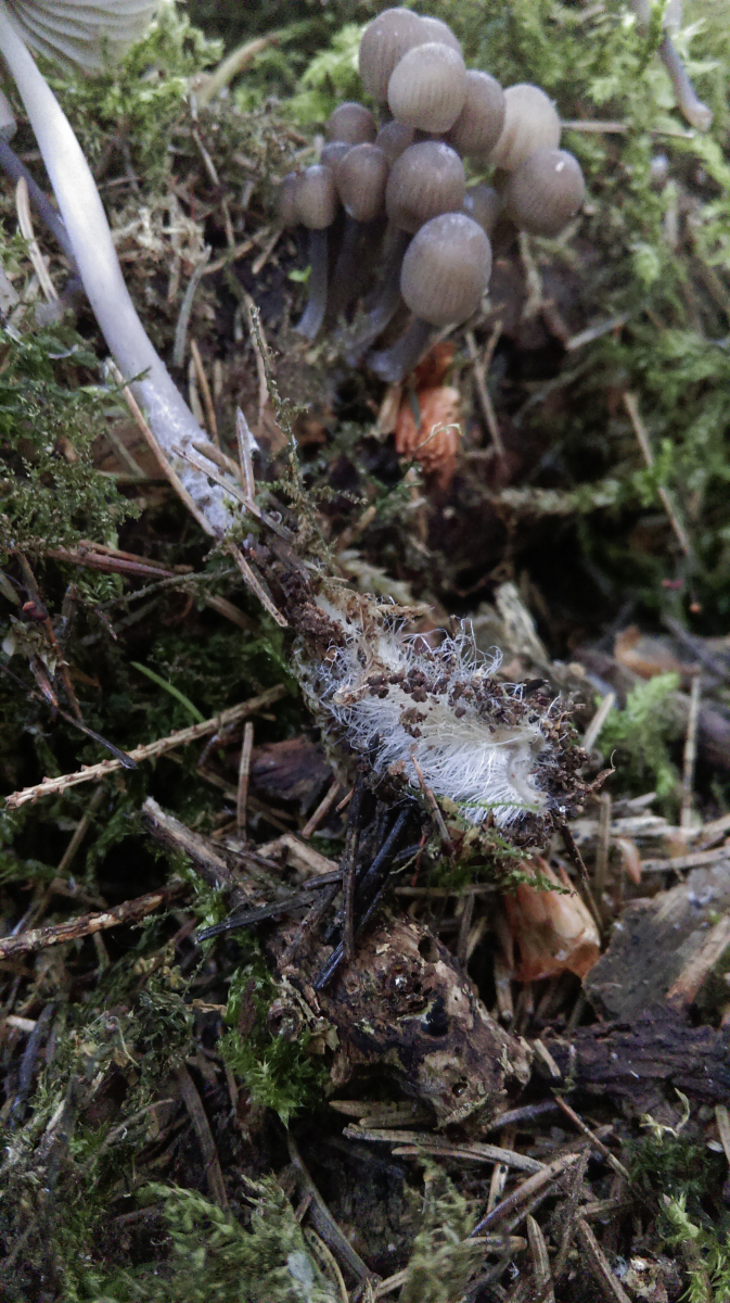 Stiel: glatt, 65 x 3 mm beim Trocknen zunehmend spindelnd, violettlicher Schein (dies sah man an den Kleinen deutlicher), an der Basis verdickt, leicht wurzelnd (?) und dicht mit weissen Mycelfäden (?) umsponnen