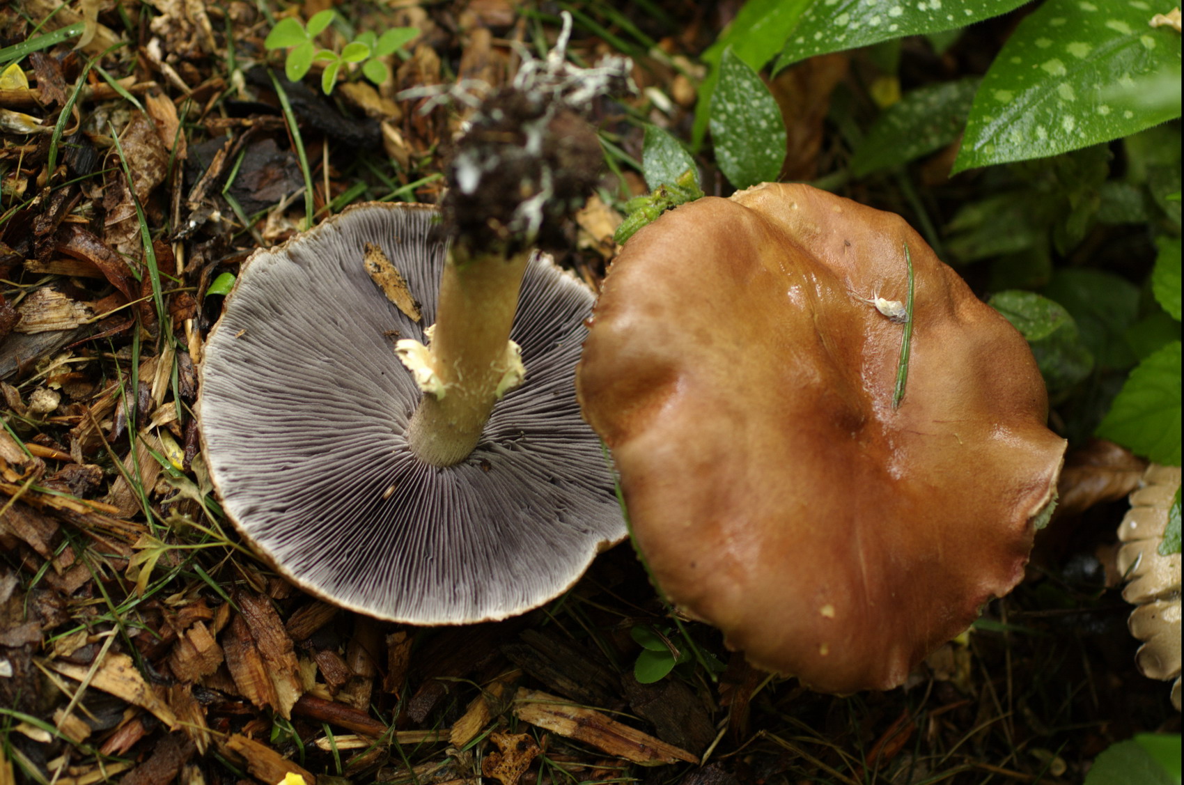 Die weisse Form des Rotbraunen Riesenträuschlings. Am ersten Foto sind die Lamellen noch mit dem Velum bedeckt. Auf dem neuen Foto ist dieses geöffnet und schon sind die knall-violetten Lamellen zu sehen.