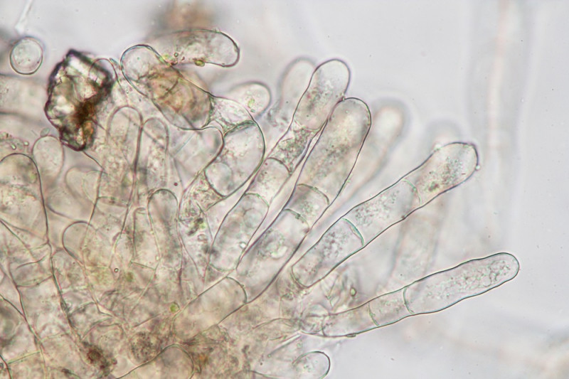 Die Ascusspitzen sind inamyloid (keine blaue Reaktion in Lugol); Paraphysen apikal zylindrisch bis keulig, mit Tröpfchen aus karotinoidem Pigment gefüllt (in Lugol grün verfärbend); die Sporen messen ohne Ornament um 13-16 x 8-10 µm; Haare der Außenseite unauffällig, hyalin, eingewachsen, kaum differenziert.