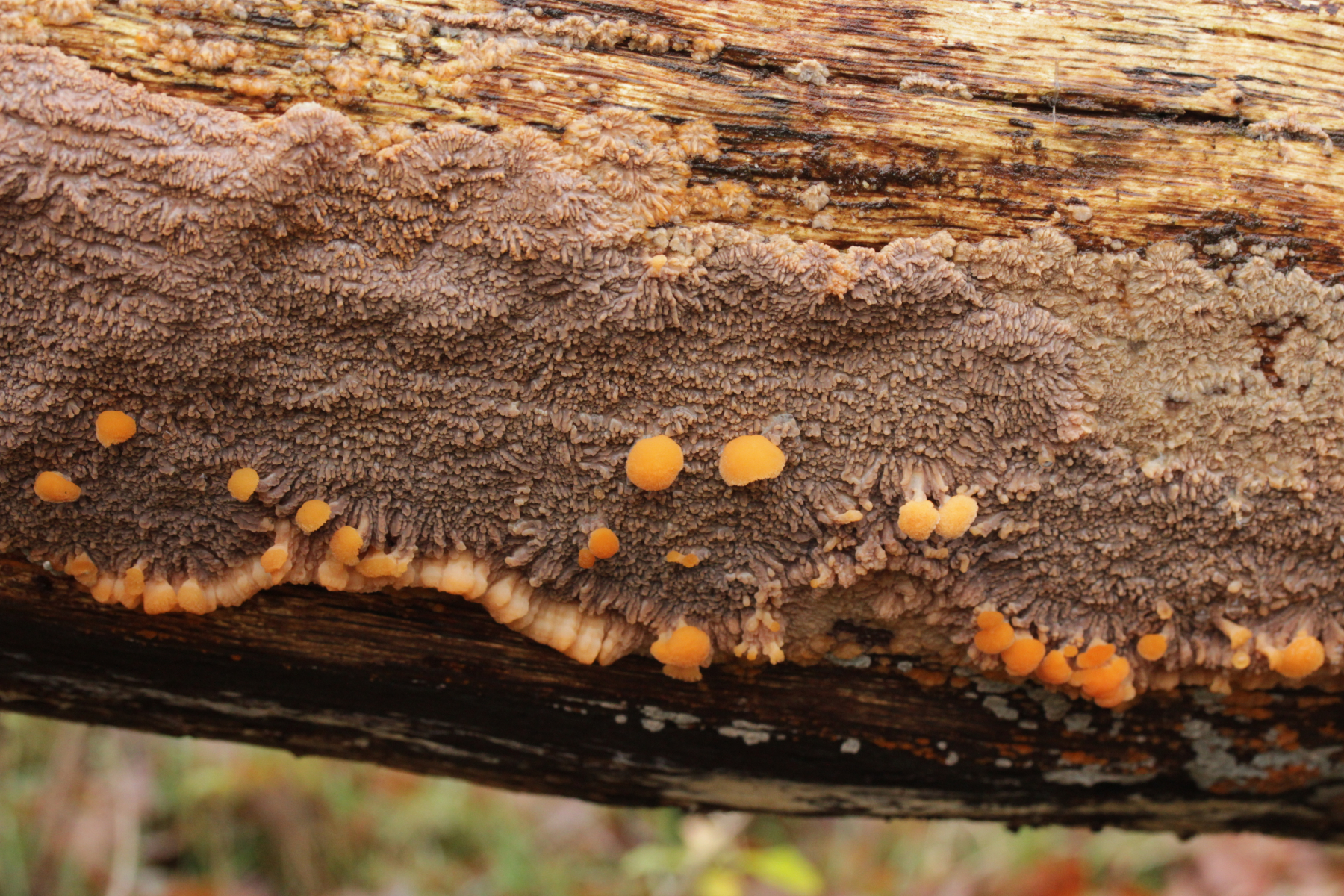 >Leucogyrophana mollusca = Orangegelbe Fältlingshaut<