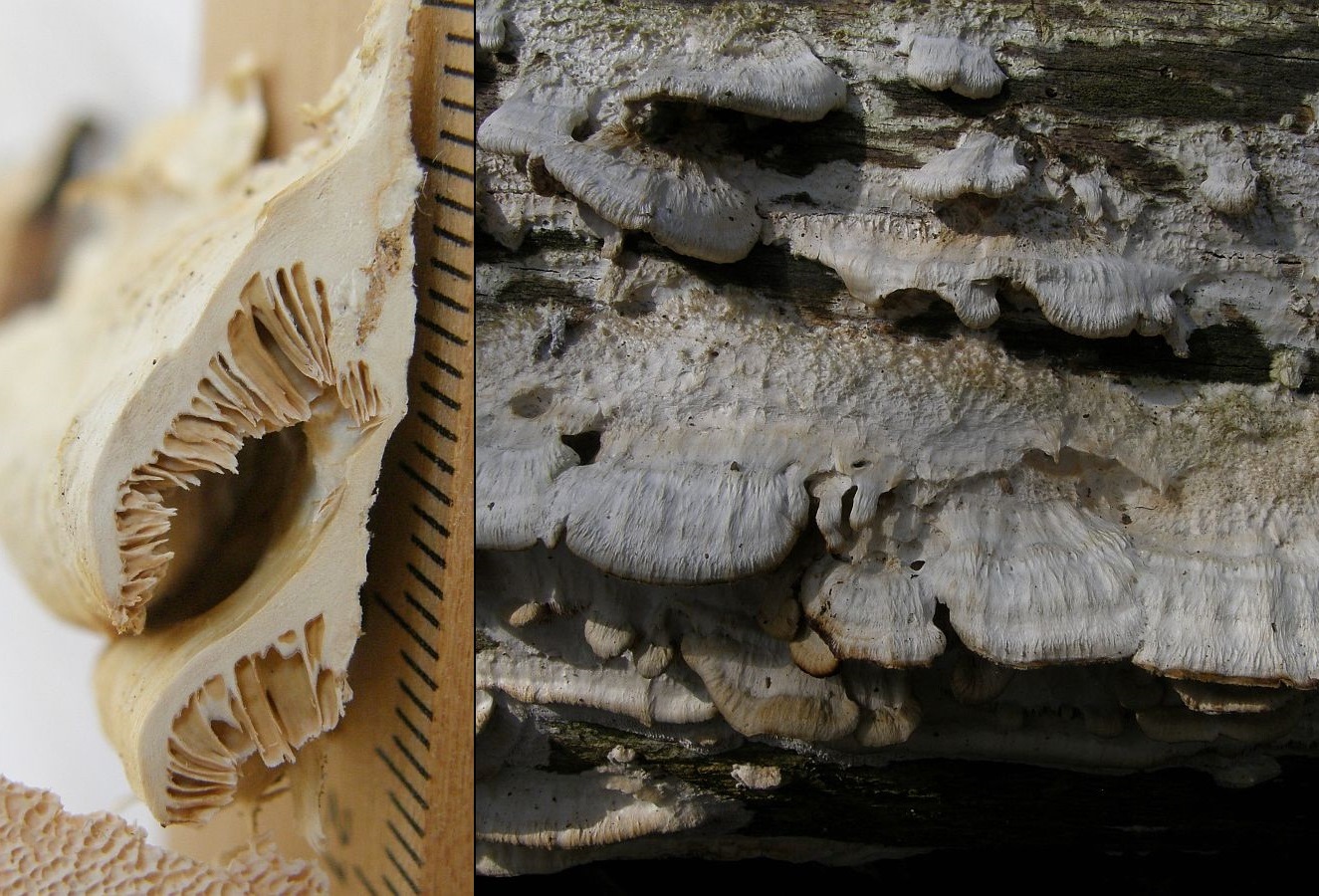 makroskopische Eigenschaften: Fruchtkörper effus-reflex, an Substratunterseiten mit ausgedehnten Resupinatanteilen, an senkrechtem Substrat mit ausgeprägten Hüten, die oft seitlich zusammenfließen und gerne in mehreren, üppigen Reihen übereinanderstehen; die Art tendiert offenbar zu weitläufigen, üppigen Fruktuationen an geeigneten Stämmen; Hutoberseiten frisch mit einem radialsträhnigen, anliegenden Haarfilz, der im Alter zu radiären Rippen verklebt; vital blass ockerlich bis blass bräunlich; im Alter und bei Trockenheit zu weiß ausblassend; Poren anfangs +/- eckig, ganzrandig, um 1-2/mm, aber bald schon irregulär geschlitzt, verlängert bis sinuos oder labyrinthisch, bei verwitterten Kollektionen tief eingerissen und vor allem an schrägem Substrat fast zahnförmig; anfangs hell cremefarben (heller als Hutoberseite), bald ockerlich, im Alter auch ockerbräunlich (dunkler als Hutoberseite); Fleisch frisch zäh und fest, unzoniert; trocken oder im Alter hart, kaum brüchig; blass holzfarben, hellockerlich, jung oder bei ausgeblassten Fruchtkörpern fast weiß; meist im gleichen Farbton wie die Röhren, nur bei alten, absterbenden Kollektionen heller; ohne spezifischen Geruch oder Geschmack.