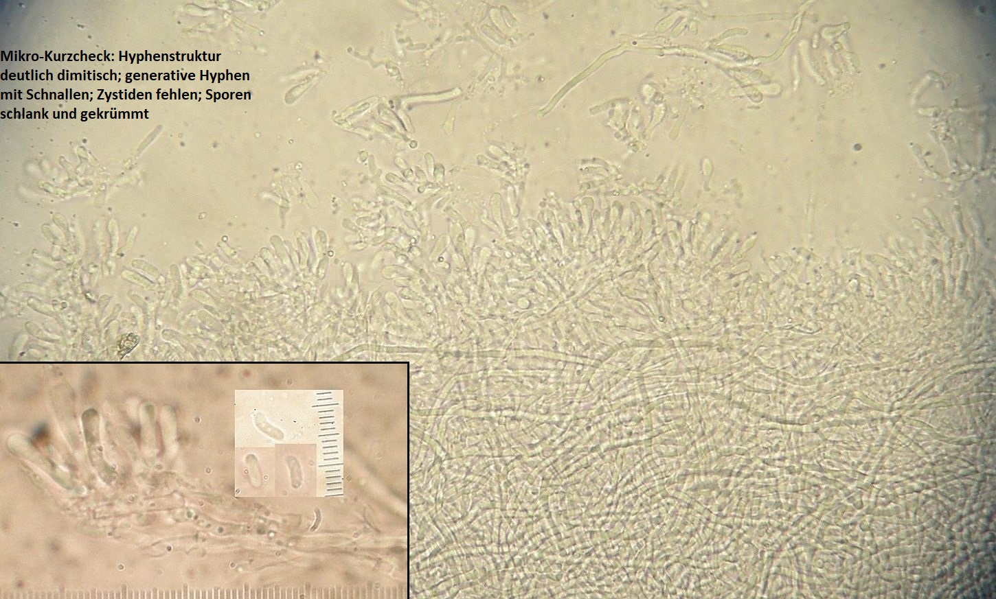 mikroskopische Eigenschaften: Hyphenstrukur dimitisch; Skeletthyphen dickwandig, unseptiert, in der Röhrentrama oft weniger dominant als im Kontext; generative Hyphen mit Schnallen, dünnwandig bis dickwandig; in den Hyphensträngen von oberem Kontext und Hutfilz ähneln verzweigte, sklerifizierte generative Hyphen gelegentlich Bindehyphen (von Jahn als –žtrimitischer Aspekt–œ beschrieben). Das ist allerdings nicht in jeder Kollektion zu beobachten.