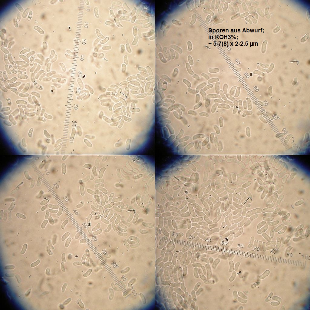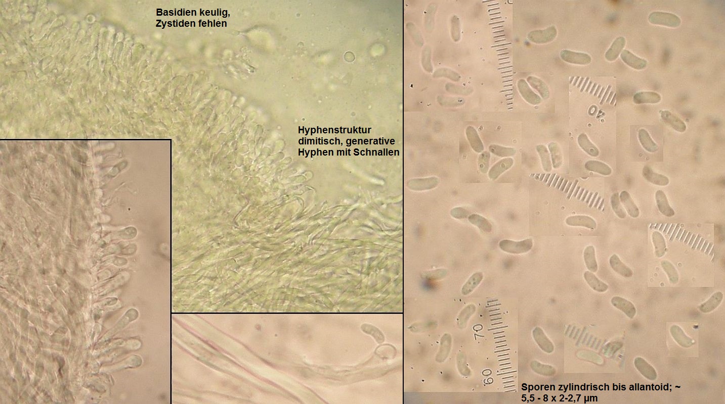 Hymenium ohne Zystiden, Basidien keulig, viersporig (selten 2-sporig), mit Basalschnalle, Zystidiolen nur sehr vereinzelt und unauffällig; Sporen zylindrisch, gekrümmt (allantoid), hyalin, dünnwandig, inamyloid; bei eigenen Messungen zusammengenommen 5-8 x 2-2,8 µm (in der Literatur oft größer beschrieben: 7-9 x 2,5-3 µm)