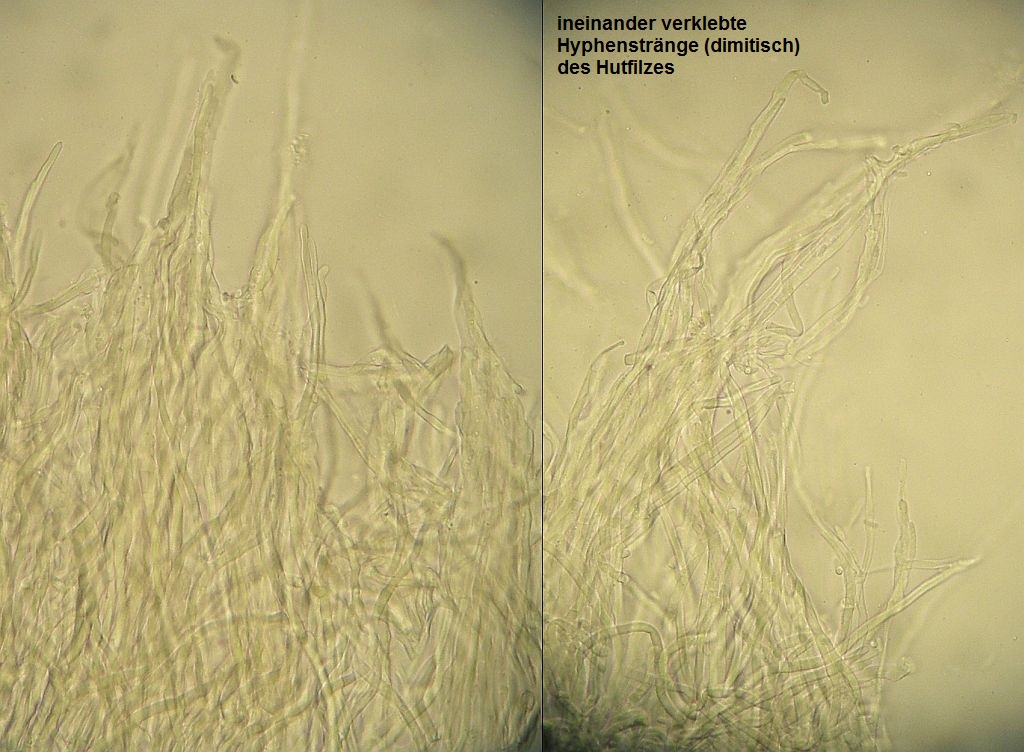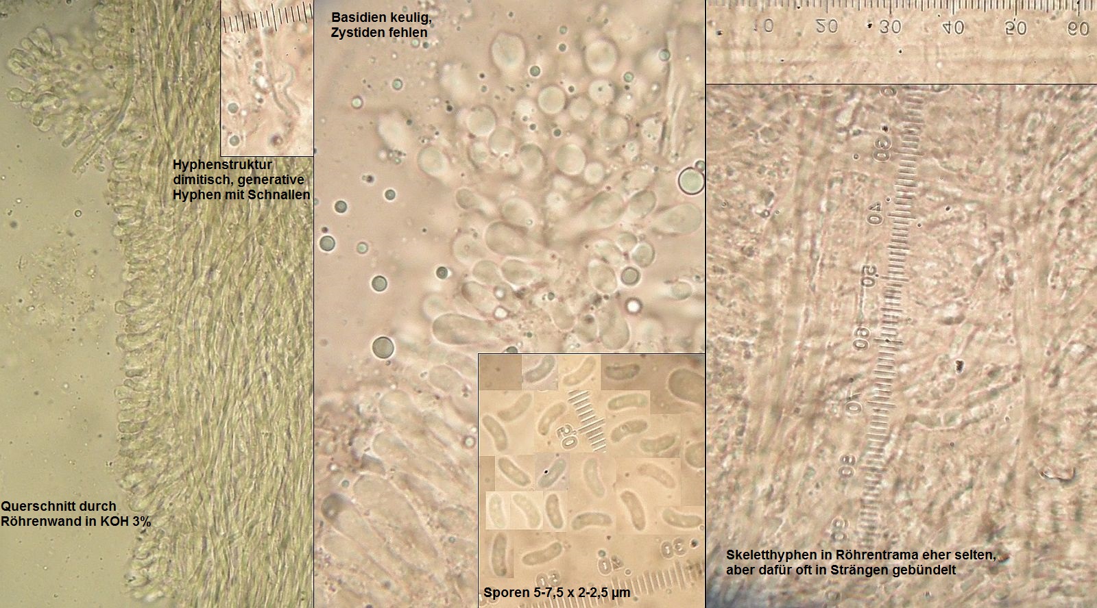 mikroskopische Eigenschaften: Hyphenstrukur dimitisch; Skeletthyphen dickwandig, unseptiert, in der Röhrentrama oft weniger dominant als im Kontext; generative Hyphen mit Schnallen, dünnwandig bis dickwandig; in den Hyphensträngen von oberem Kontext und Hutfilz ähneln verzweigte, sklerifizierte generative Hyphen gelegentlich Bindehyphen (von Jahn als –žtrimitischer Aspekt–œ beschrieben). Das ist allerdings nicht in jeder Kollektion zu beobachten.