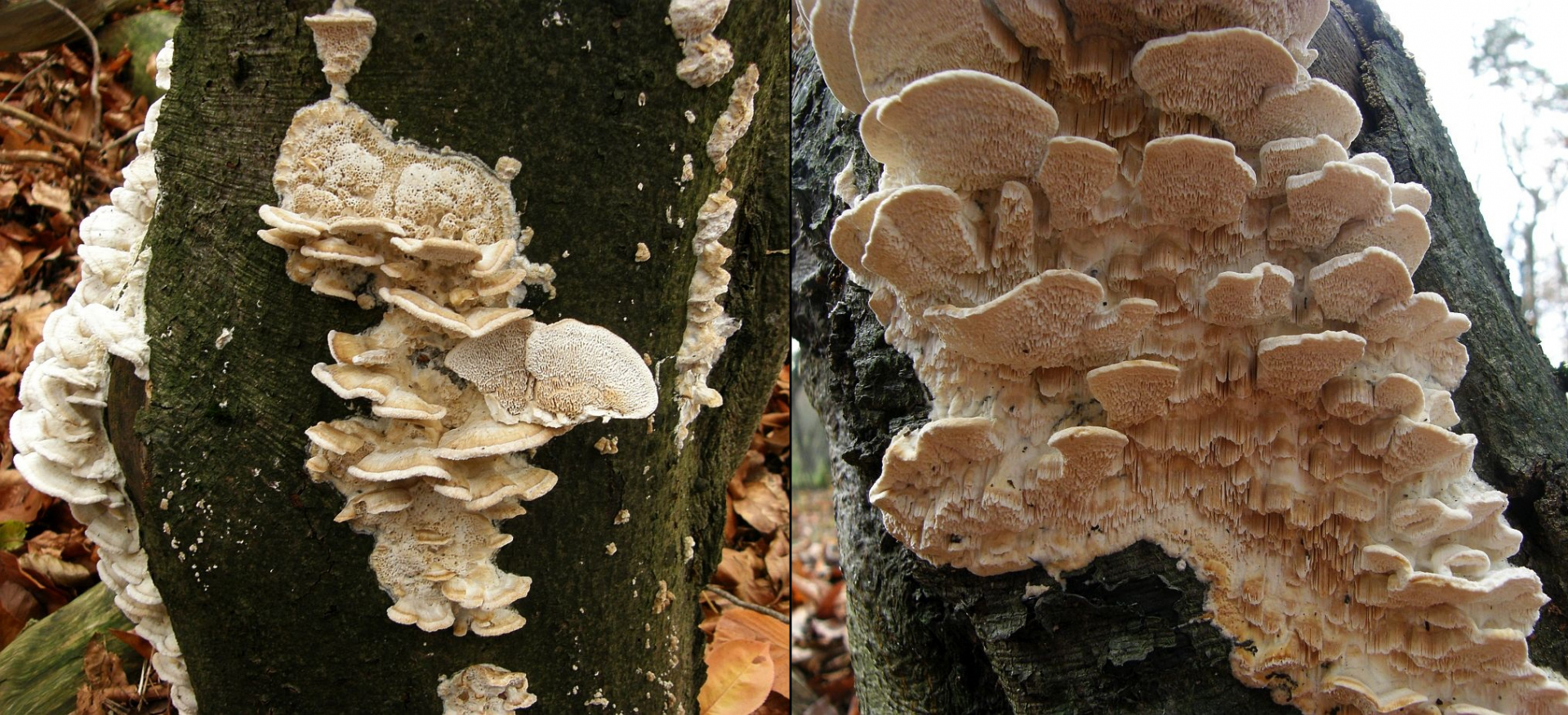 Verwechslungen: In typischer Ausprägung kann man die Art im Wald schon aus 10 Metern Entfernung bestimmen. An einem liegenden Buchenstamm sind die weit ausgebreiteten, üppig ineinander fließenden Fruchtkörper in ihrem hell ockerlichen Farbspiel ein beeindruckender Anblick.