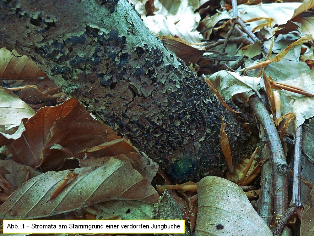 Substrat: Die Stromata sitzen einzeln, meist dicht an dicht, am Stammgrund einer 30-40 mm dicken, verdorrten Jungbuche (Fagus). Sie brechen unter der Rinde hervor und drücken sie dabei kragenartig hoch (Abb. 1).