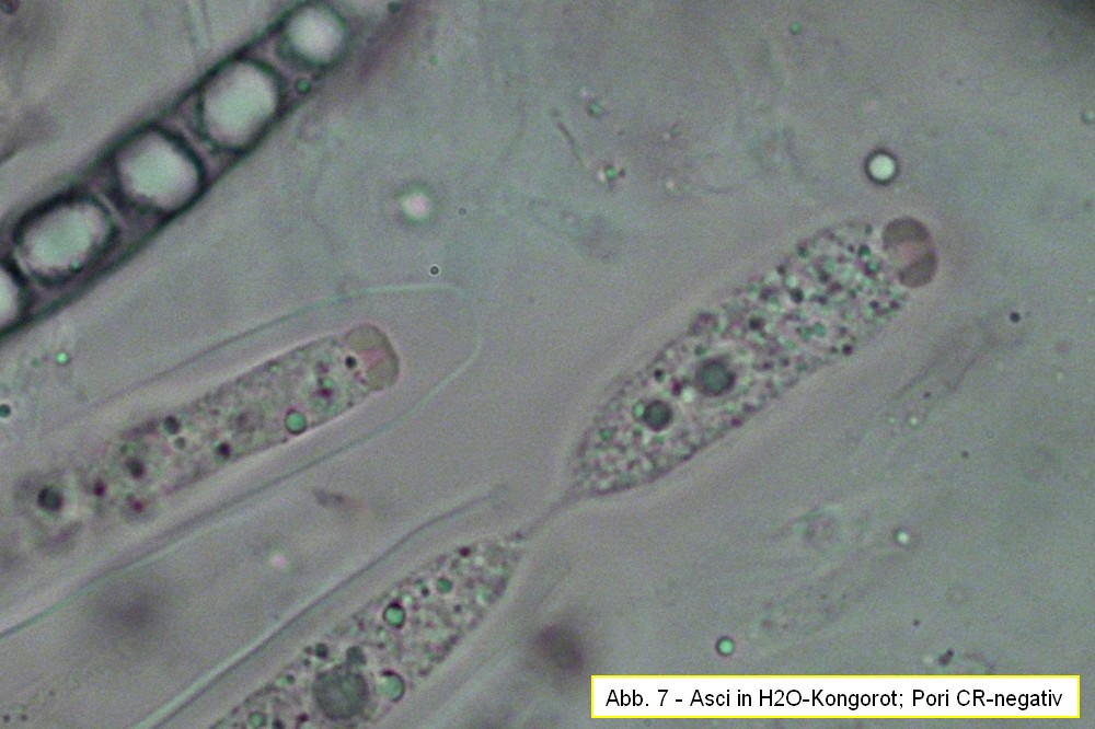 Wichtige Frage: Mir sind die Färbungen des Ascusporus mit Baralscher Lösung und mit Kongorot nicht ganz klar: Nach meiner Beobachtung mit "Baral" minimal bläulich und mit wassergelöstem Kongorot minimal rötlich. - Oder irre ich mich da?