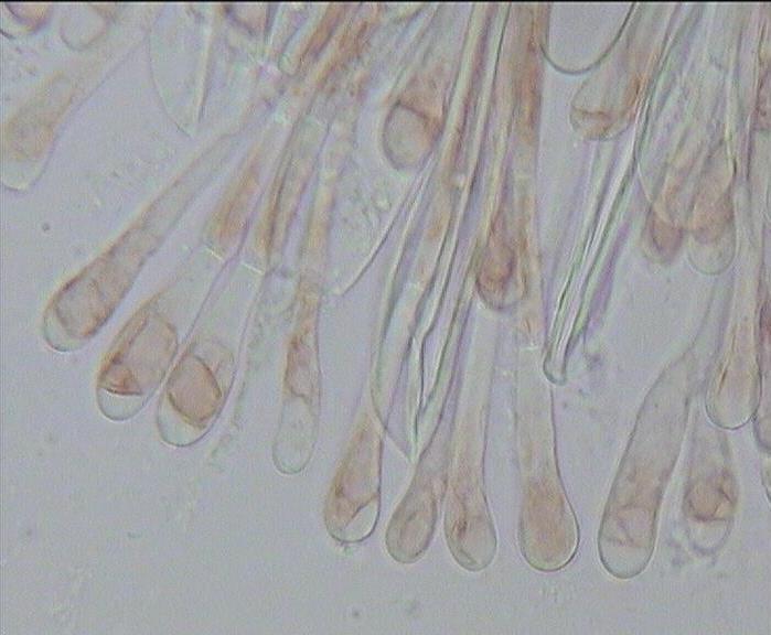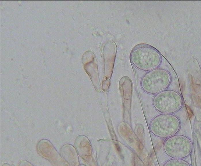 Die Paraphysen sind kopfig und rötlich. Der Kopf ist 10 µm breit.