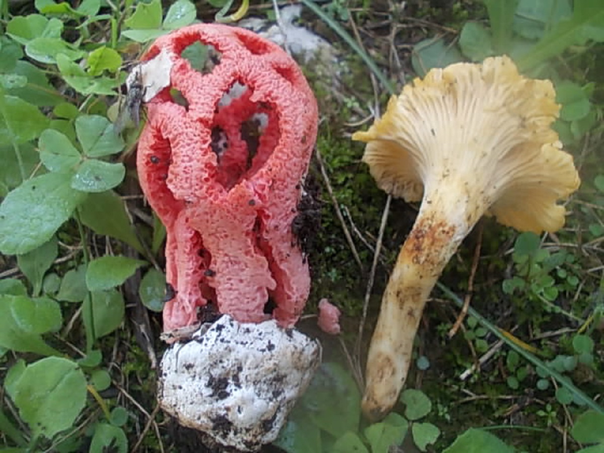 8. Platz  - Bild 2 (beli 1) mit Roter Gitterling (Clathrus ruber)[font="arial, sans-serif"]    [/font]& Pfifferling (Cantharellus cibarius)