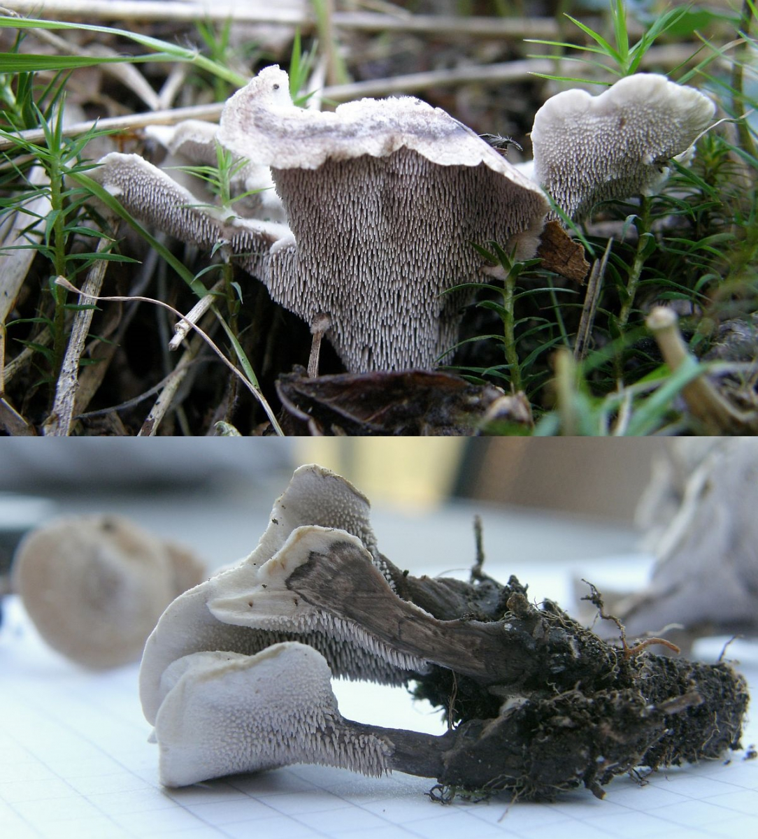 makroskopische Eigenschaften: Fruchtkörper mehr oder weniger gestielt; auf Erdboden oder auf umliegendem Detritus, bisweilen werden Fruchtkörper auch bodennah auf Ästen und an Baumstümpfen platziert; gesellig in Gruppen, oft annähernd büschelig, seltener einzeln; Hüte unregelmäßig geformt, meist miteinander verwachsen und ineinander übergehend; Oberseite jung mit weißem bis graubraunem Filz überzogen, im Alter dunkler, jung bisweilen mit stacheligen Auswüchsen; alt mit angedrückt strähnigem Haarfilz, der sich oft ins braune oder rotbraune verfärbt; Stiele kurz und kräftig, meistens exzentrisch; im Schnitt zweischichtig, mit schwammig –“ filziger Außenschicht und festerem Innenfleisch; Stacheln geotrop, am Stiel herablaufend, jung grauweißlich, manchmal mit purpurbraunem Schimmer, später mehr weißlich bis graubraun; Fleisch mit Duplexstruktur, Filzschicht an Hutoberfläche und Stieloberfläche im Schnitt deutlich, weißlich bis dunkelbraun oder rotbraun (alt und durchnässt auch schwarzbraun); inneres Fleisch weißlich, cremefarben bis dunkelbraun; ausgequetschtes Stielinnenfleisch (frische Exemplare) oder dünn abgekratztes Stielinnenfleisch (Exsikkat) färbt sich in KOH 10% ockerlich bis olivbraun; Geruch frisch unspezifisch, getrocknet deutlich nach Maggiwürze (bei gut verschlossenen Exsikkaten noch nach vielen Jahren kräftig ausgeprägt).