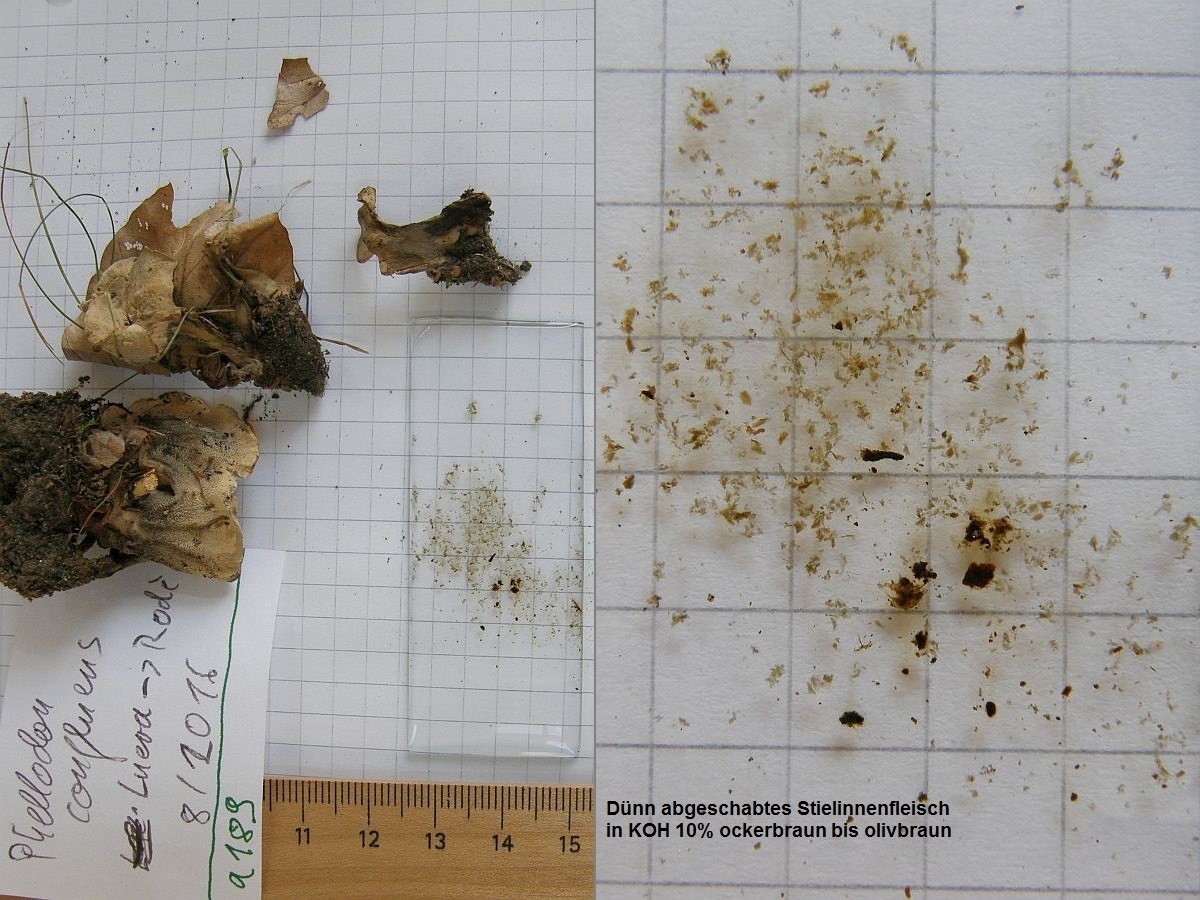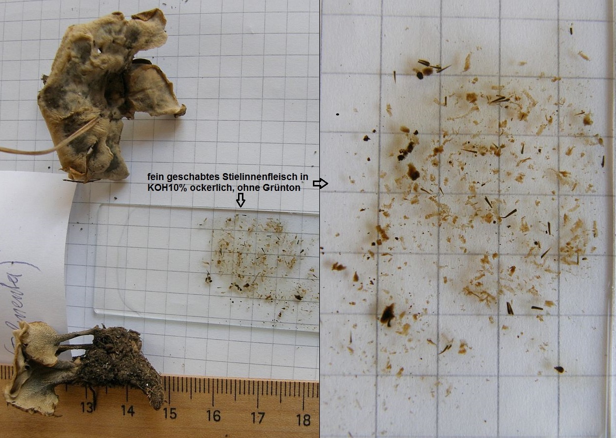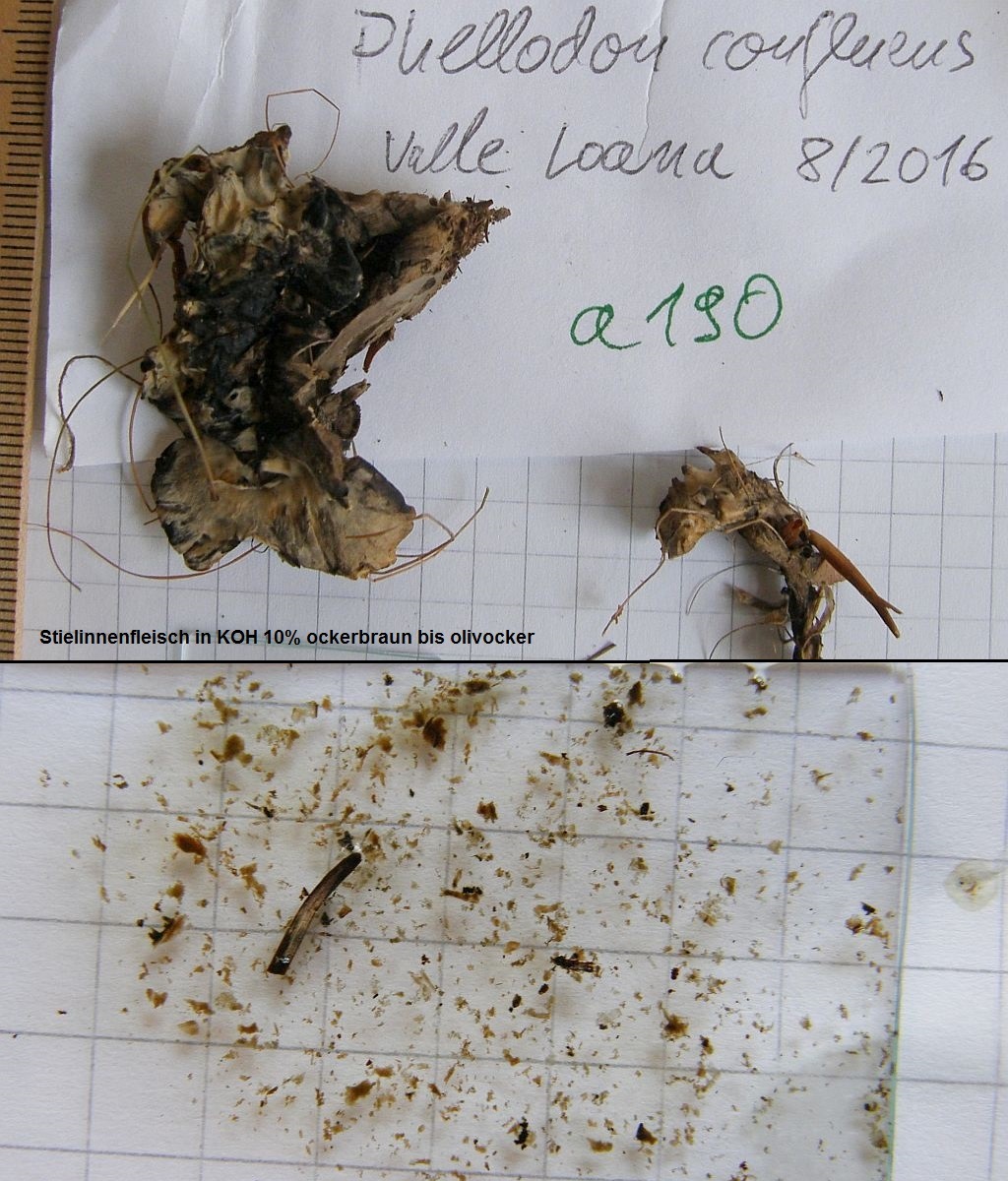Bei Phellodon confluens ist das Fleisch der inneren Schicht (im Stiel) hellbraun, rotbraun oder dunkel graubraun, es reagiert mit KOH10% (nur ganz dünne Krümel und Fasern aus dem Fleisch in 10% KOH geben!) allenfalls olivbraun, meist aber ockerlich.