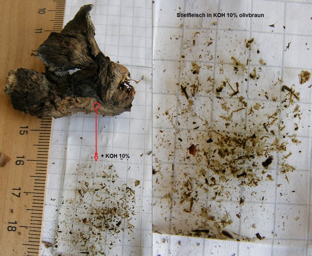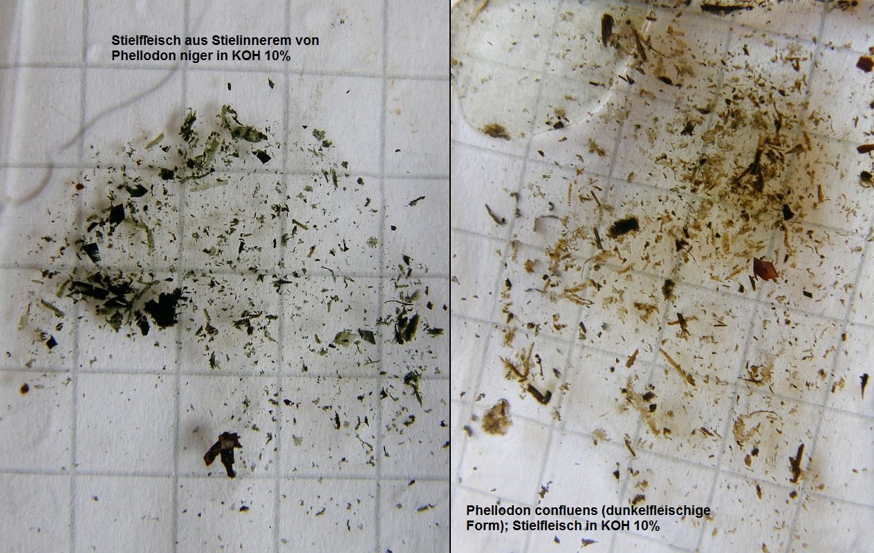Bei Phellodon niger ist das Fleisch der inneren Schicht glänzend schwarz oder grauschwarz ohne Brauntöne und reagiert deutlich olivgrün bis grün in KOH10%.