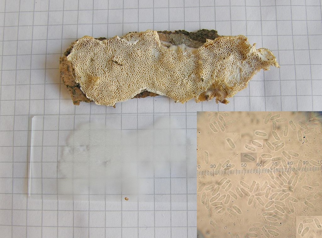 Die Fruchtkörper von Dichomitus campestris schwärzen mit der Zeit deutlich, alle Arten der Gattung sehen mikroskopisch ganz anders aus.