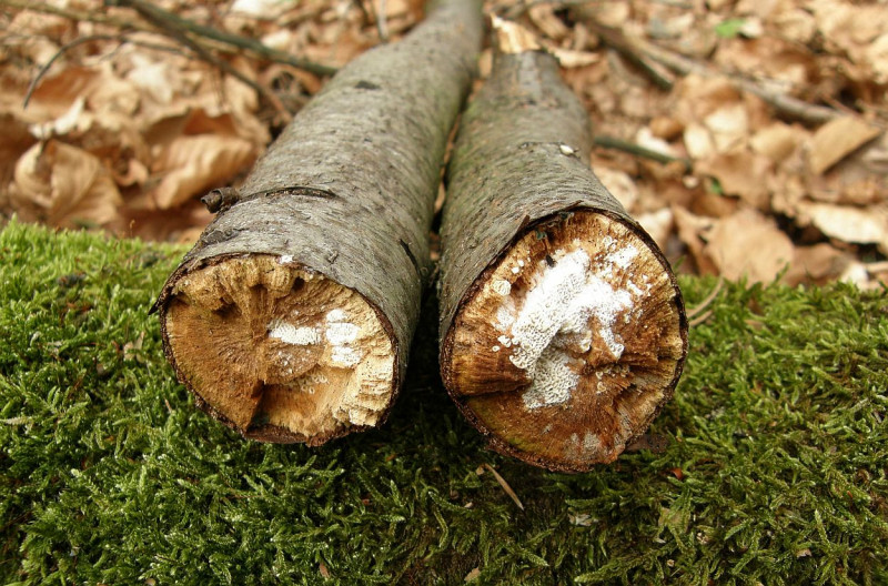 A) 17.04.2016; Schwetzinger Hardt, liegender, noch berindeter Laubholzast; auf sandigem, +/- frischem Boden, Übergang vom sandigen Rotbuchen –“ Kiefern –“ Mischwald zum bachnahen Gelände mit Auwaldcharakter (Eschen, Weiden, Ahorn, Pappel):