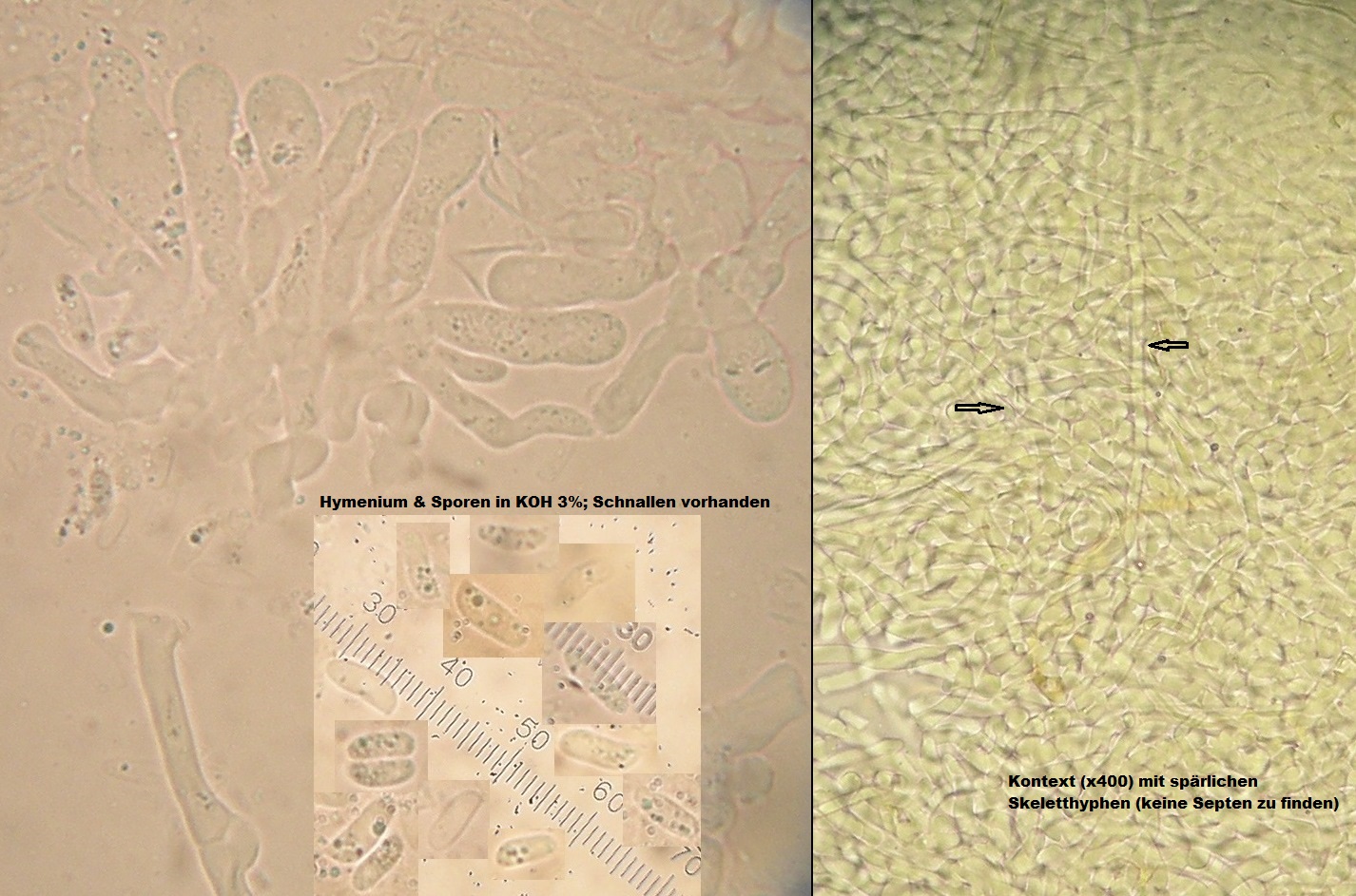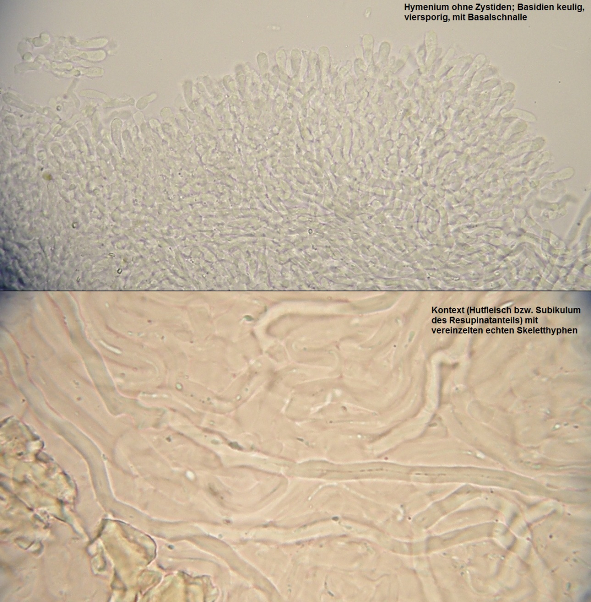 Im Kontext / Subikulum können neben den dickwandigen, auch hier oft knorzeligen generativen Hyphen vereinzelt echte Skeletthyphen auftreten (in KOH +/- unveränderlich, nicht anschwellend). Diese sind allerdings schwer zu beobachten, weil man einzelne Hyphen über eine lange Strecke verfolgen können muss, um das Vorkommen von Septen auszuschließen.