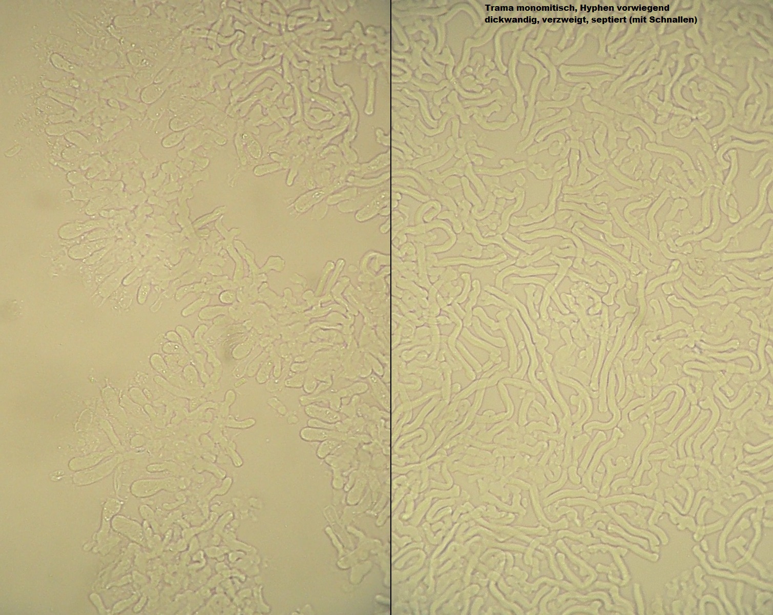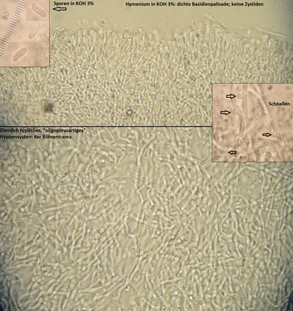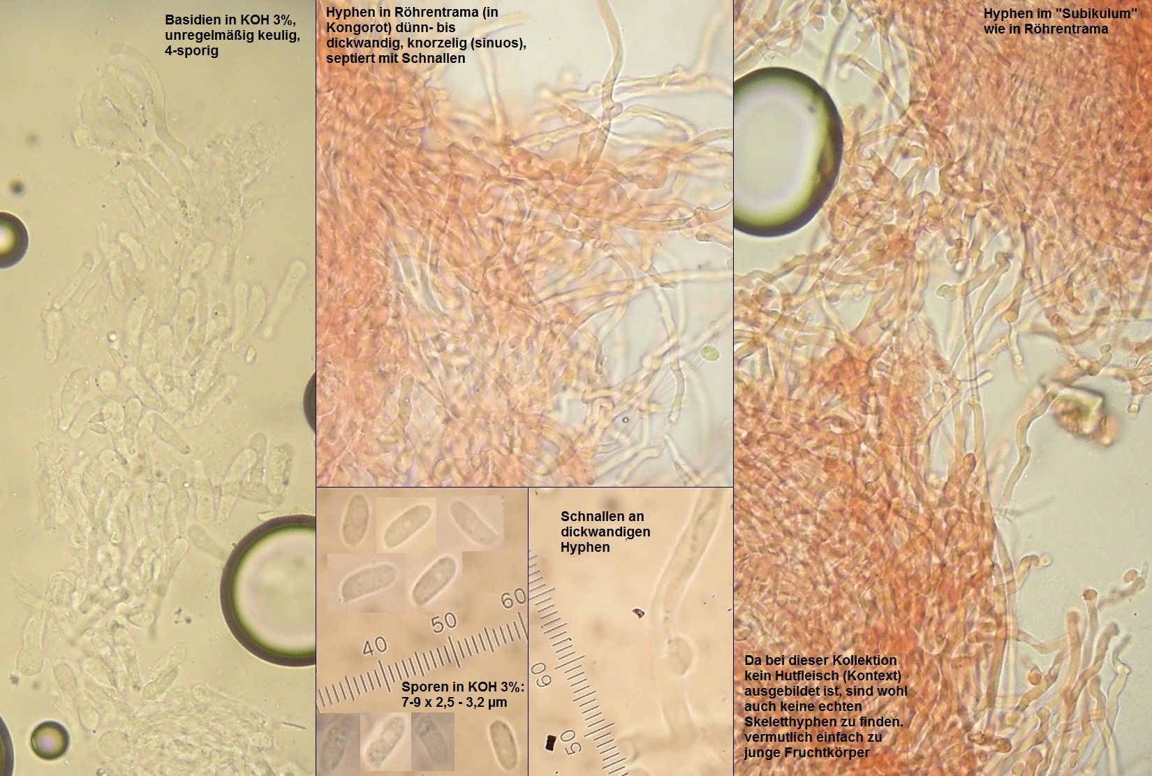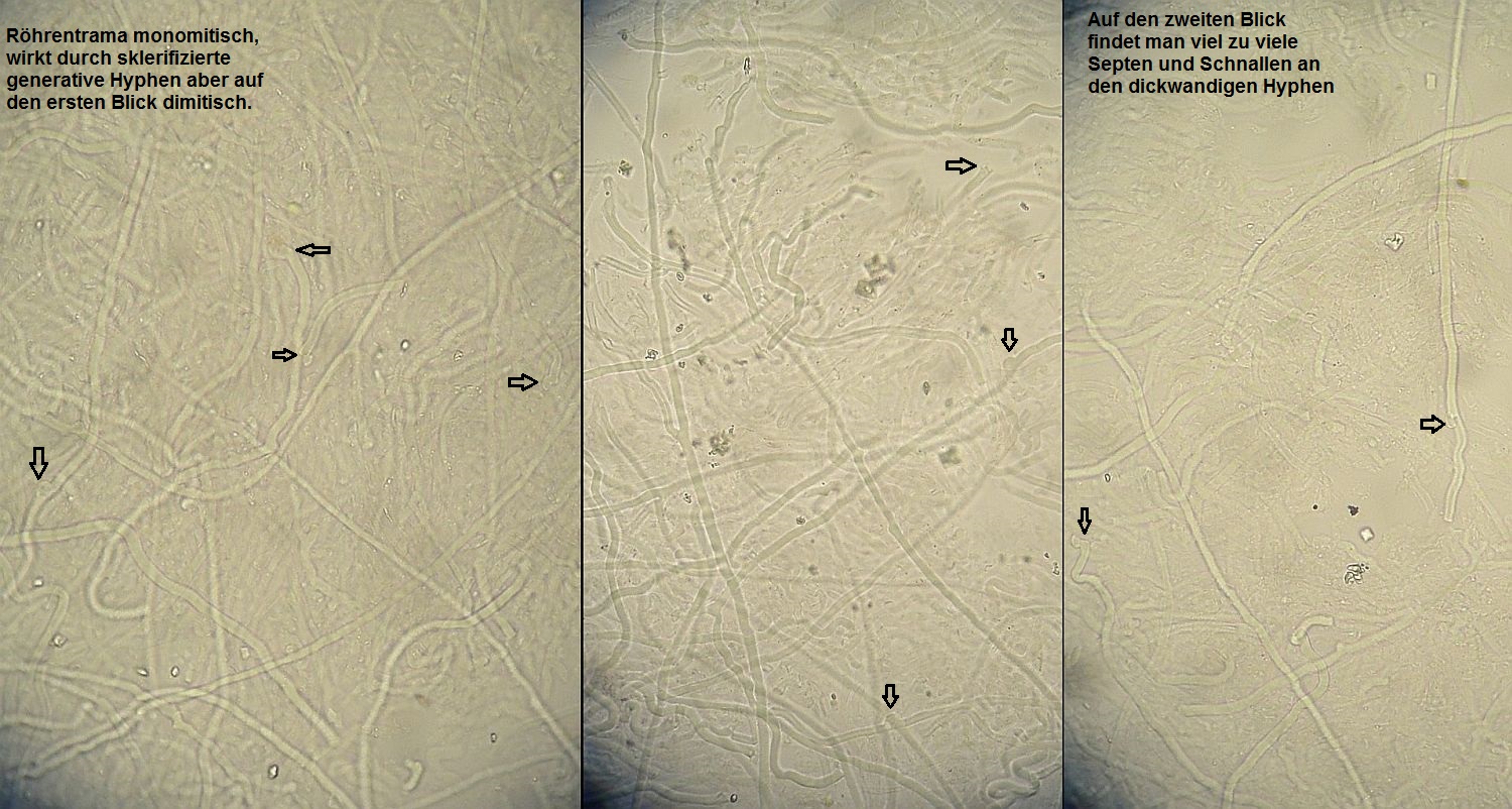 mikroskopische Eigenschaften: Hyphenstruktur in Röhrentrama monomitisch: Generative Hyphen im Subhymenium meist dünnwandig; in der Trama vorwiegend dickwandig, teilweise mit sehr dünnem Lumen, septiert, gewunden und gelegentlich etwas sinuos; einige dickwandige Hyphen können recht langzellig sein (von Septe zu Septe), so daß sie auf den ersten Blick Skeletthyphen ähnlich sehen. Es finden sich aber stets an diesen Hyphen auch Septen mit Schnallen.