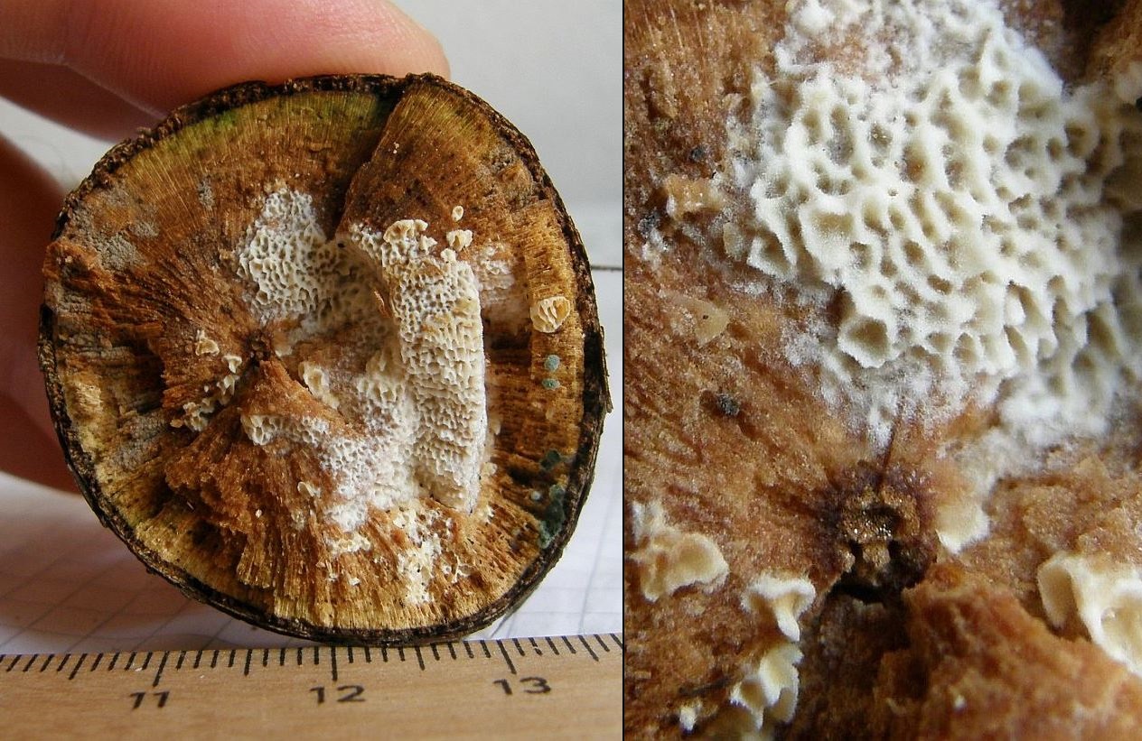 >Antrodia malicola = Zimtfarbene Braunfäuletramete<