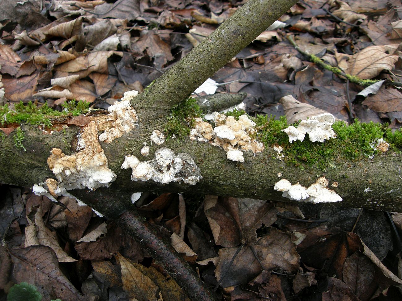 A) 17.04.2016; Schwetzinger Hardt, liegender, noch berindeter Laubholzast; auf sandigem, +/- frischem Boden, Übergang vom sandigen Rotbuchen –“ Kiefern –“ Mischwald zum bachnahen Gelände mit Auwaldcharakter (Eschen, Weiden, Ahorn, Pappel):
