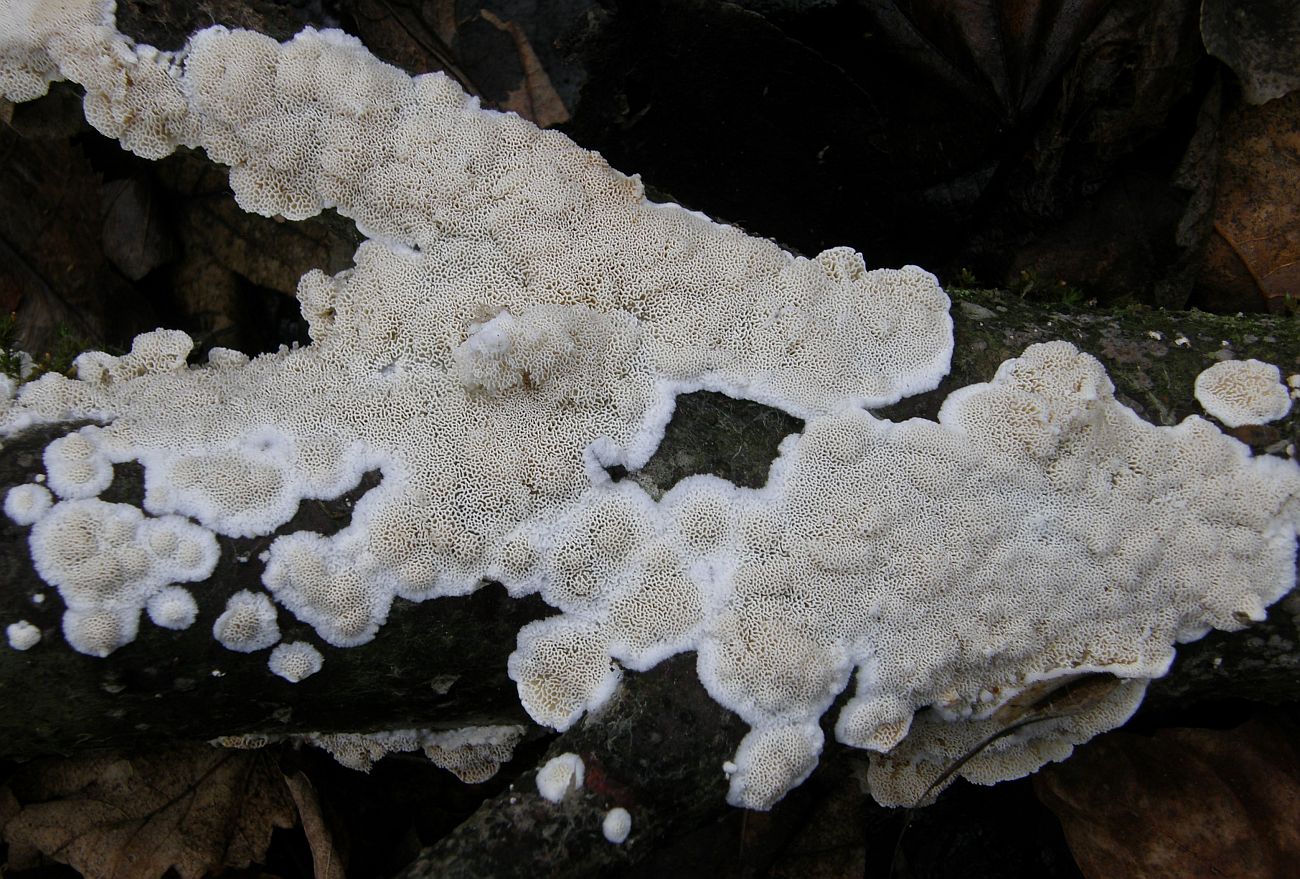>Antrodia serpens = Weiße Braunfäuletramete<