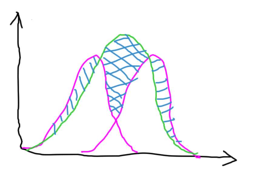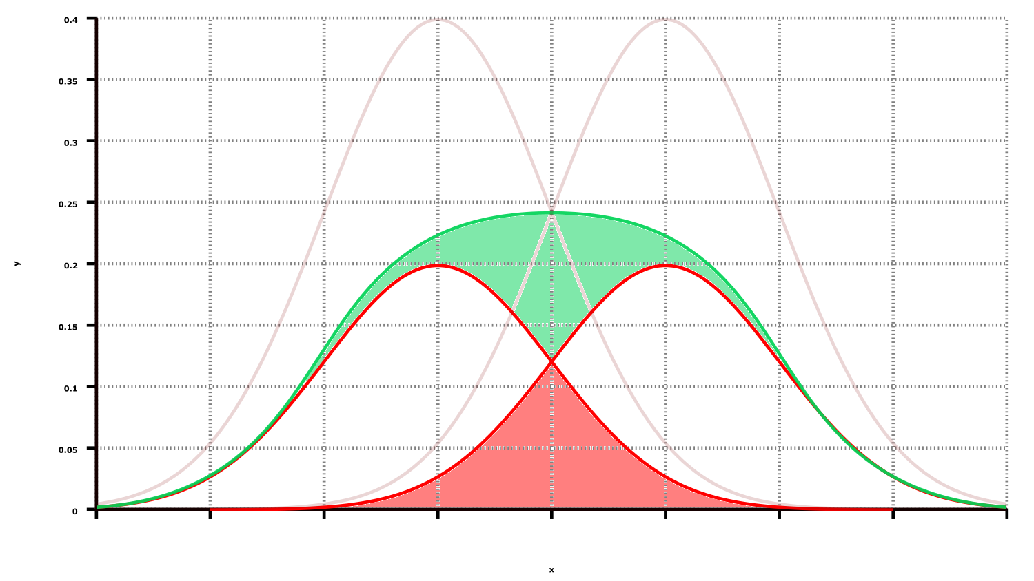 • Die Fläche unter deinen Verteilungen ist die Wahrscheinlichkeit. Wenn du also die zwei grauen Verteilungen in einer grünen Kurve darstellen möchtest, würde die grüne Kurve nicht durch den Schnittpunkt der beiden grauen verlaufen, sondern viel weiter oben ihr Maximum haben.