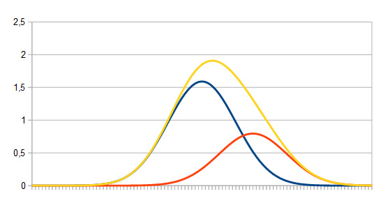 So sähe die grüne resultierende Normalverteilung (in etwa.. ;) ) aus.