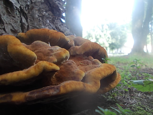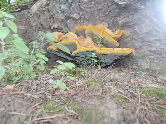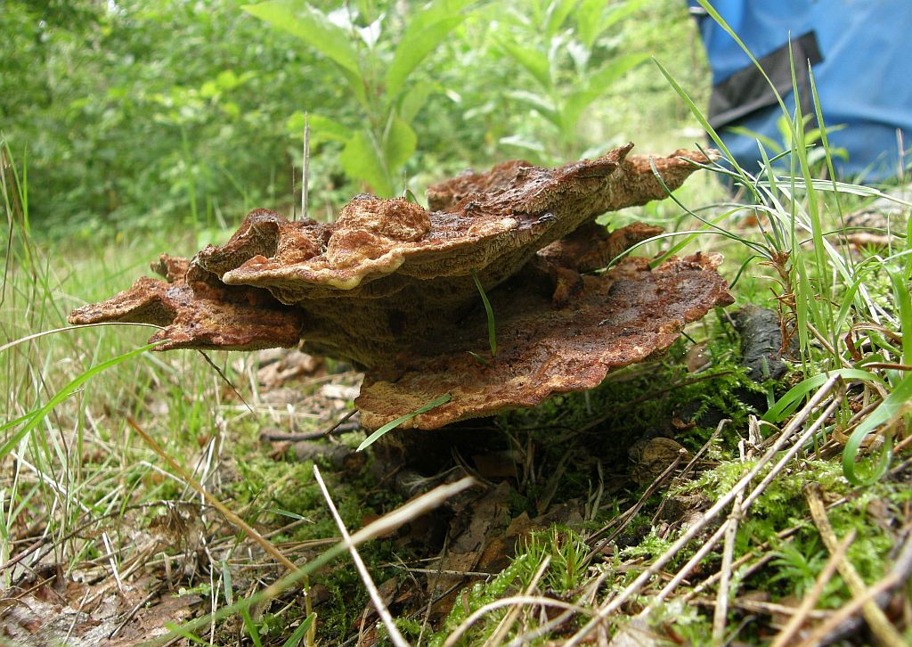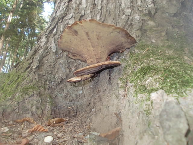Aber wie oben schon festgestellt kann Phaeolus schweinitzii in Ausnahmefällen so ziemlich jedes Substrat besiedeln und zumindest an Kiefern und Lärchen habe ich den auch schon in +/- zwei Metern höhe an noch stehenden aber abgestorbenen Stämmen entdeckt.