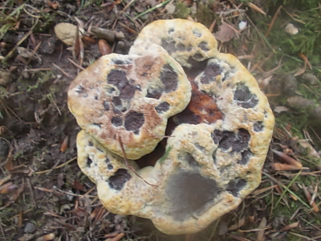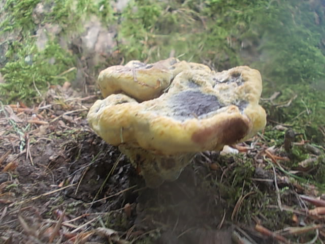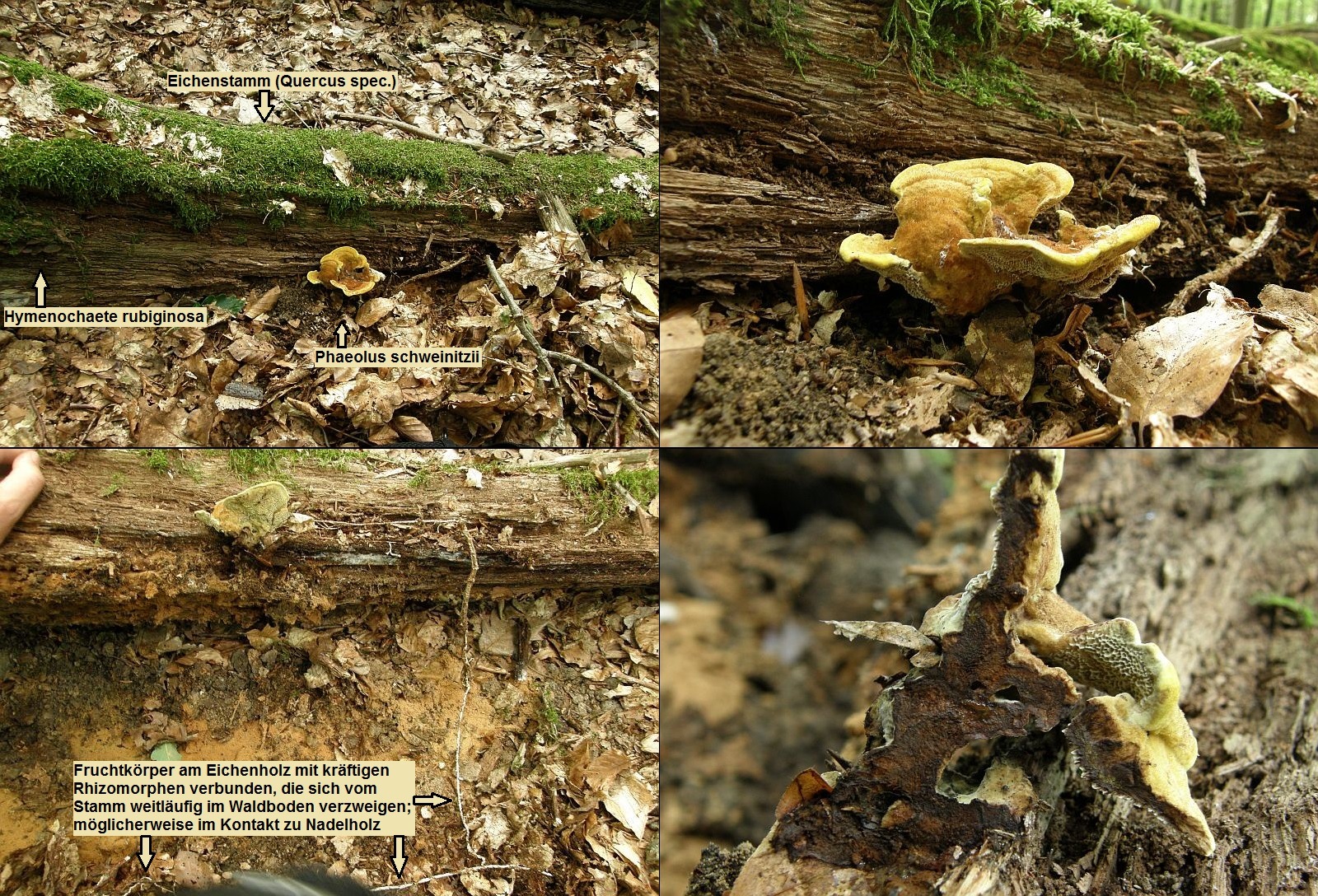 Man könnte vermuten, daß der Organismus (also das Individuum von Phaeolus schweinitzii) sein Mycel recht großflächig in dem Waldstück angesiedelt hat und sicher auch mit einigen Fichten- und Kiefernstümpfen in der Umgebung in Kontakt steht.