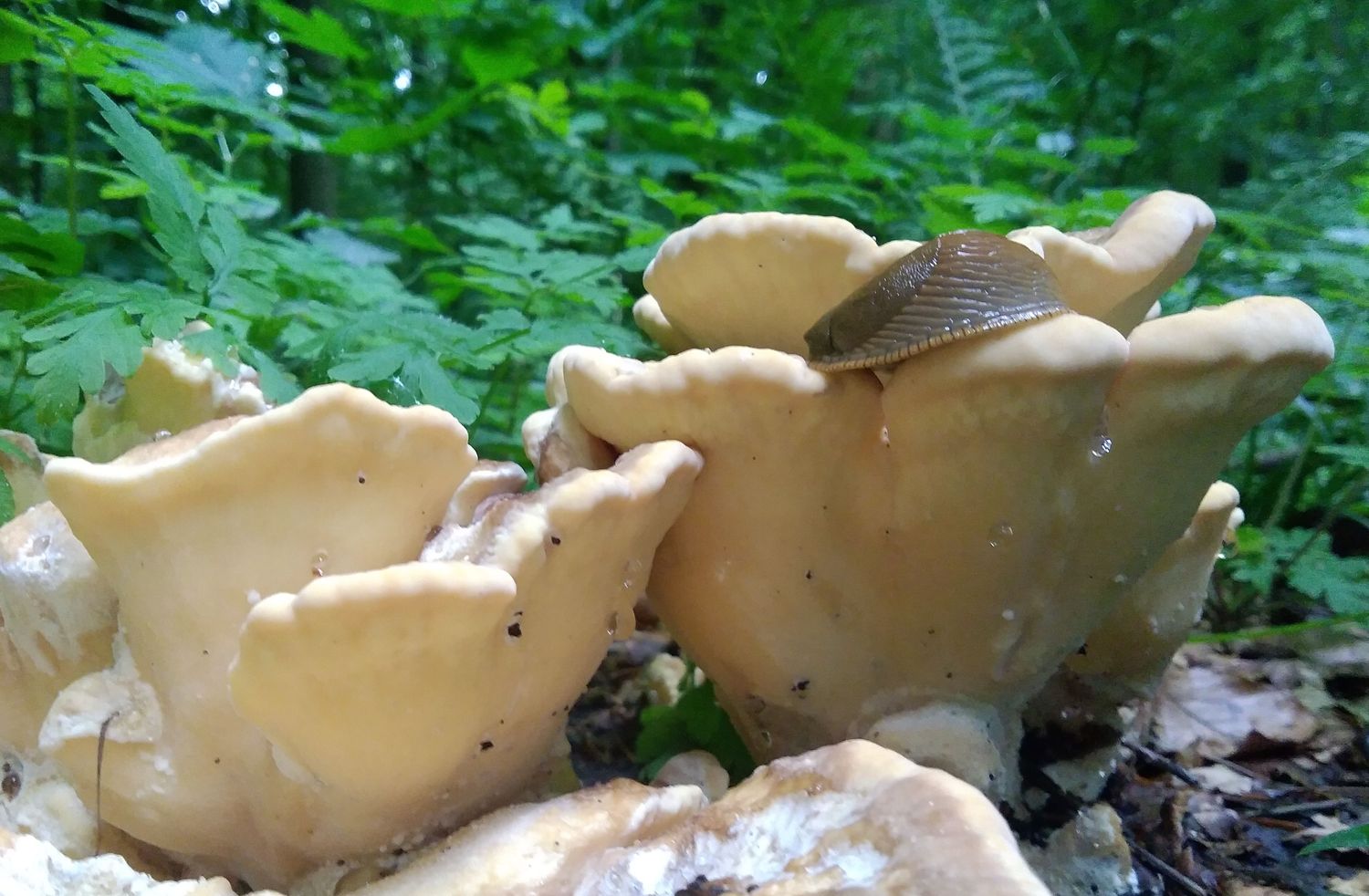 Hier der ganze Fruchtkörper im Wald. Auf den Bildern oben ist ein Stück davon und zwar dasselbe das ganz vorne im 1. Bild zu sehen ist. Leider habe ich nur eine Handykamera dabei gehabt, deshalb sind die Bilder farblich etwas anders als oben (weniger gelb), aber man kann gut sehen wie jung dieses Exemplar noch war und wie sauber die Hutunterseite gewesen ist.