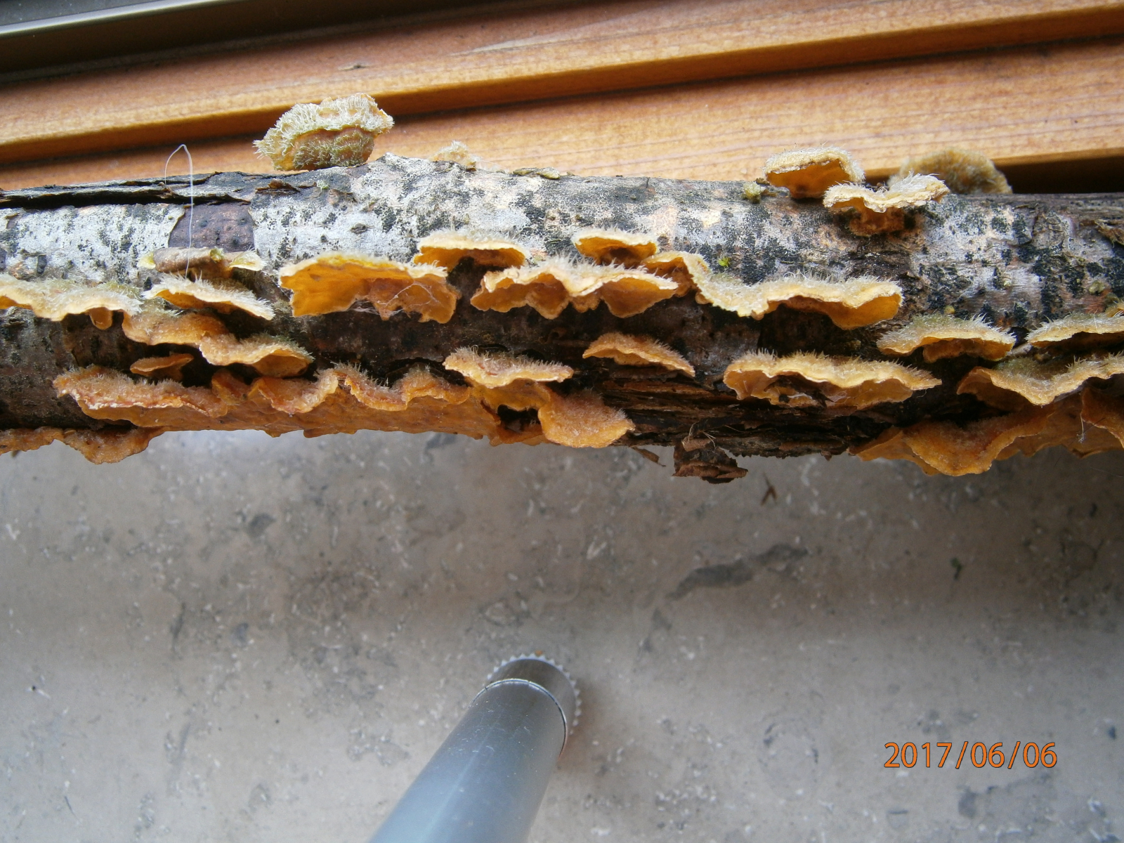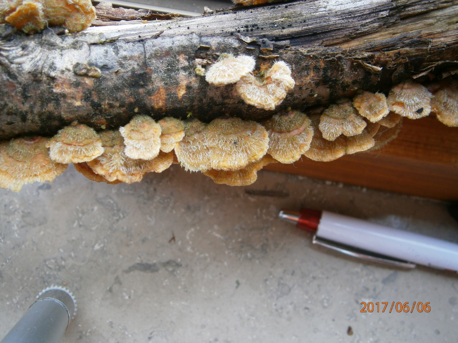 der ist schon eher "banal", aber der BLV-Führer hat - vor allem bei Nicht-Hutpilzen - durchaus seine Grenzen, wobei er sogar drin ist, aber seitlich und nicht von oben und unten abgebildet wurde. Das ist der Striegelige Schichtpilz (Stereum hirsutum). Die kräftig orangene Unterseite und die striegelige Oberfläche in Kombination sind typisch für die häufige Art. Dennoch ein optisch schöner Fund! :)