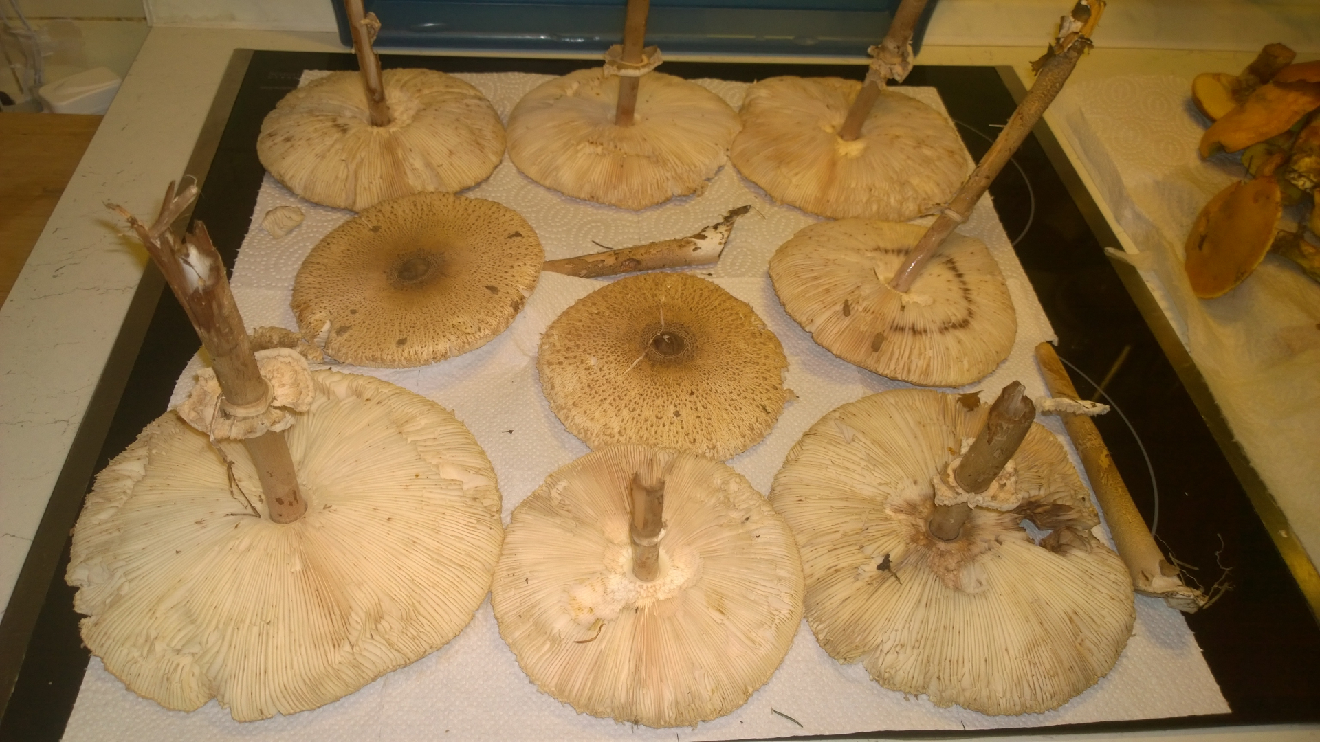 einige Parasolpilze, Pfiffer, riesige Krause Glucke, massig Goldröhrlinge, einige Steinis, Maronen aber wir sind uns unsicher bei den zwei kleinen kugligen Pilzen unten links, beim Abschnitt verfärbten sie sich Blau (1. Bild), wer könnte uns da weiter helfen?