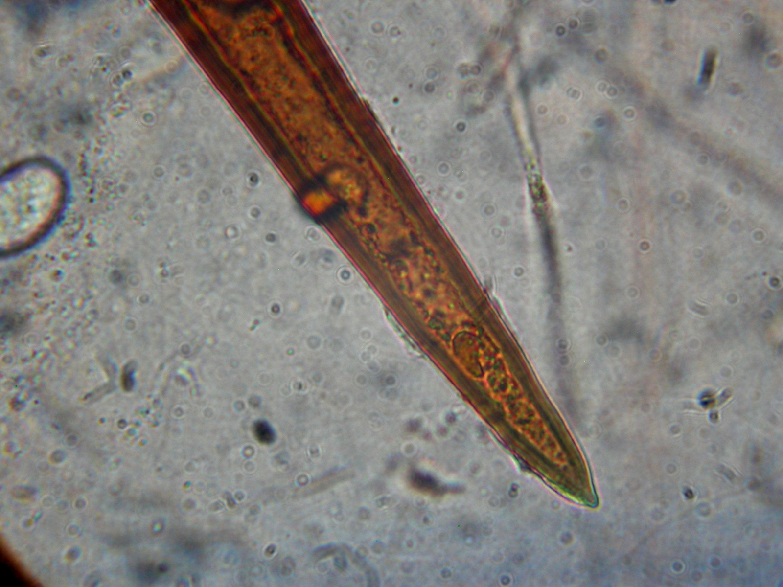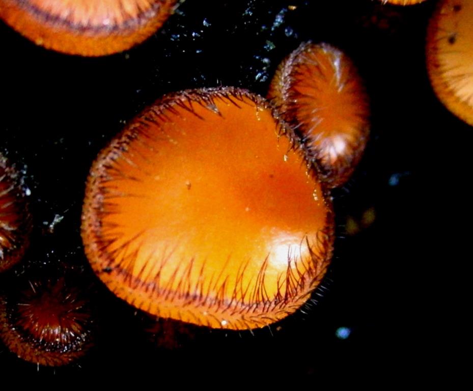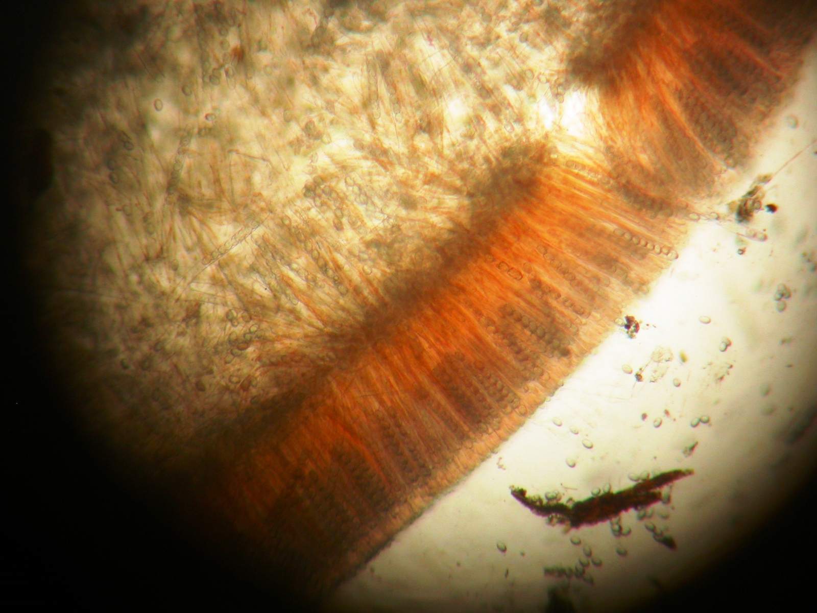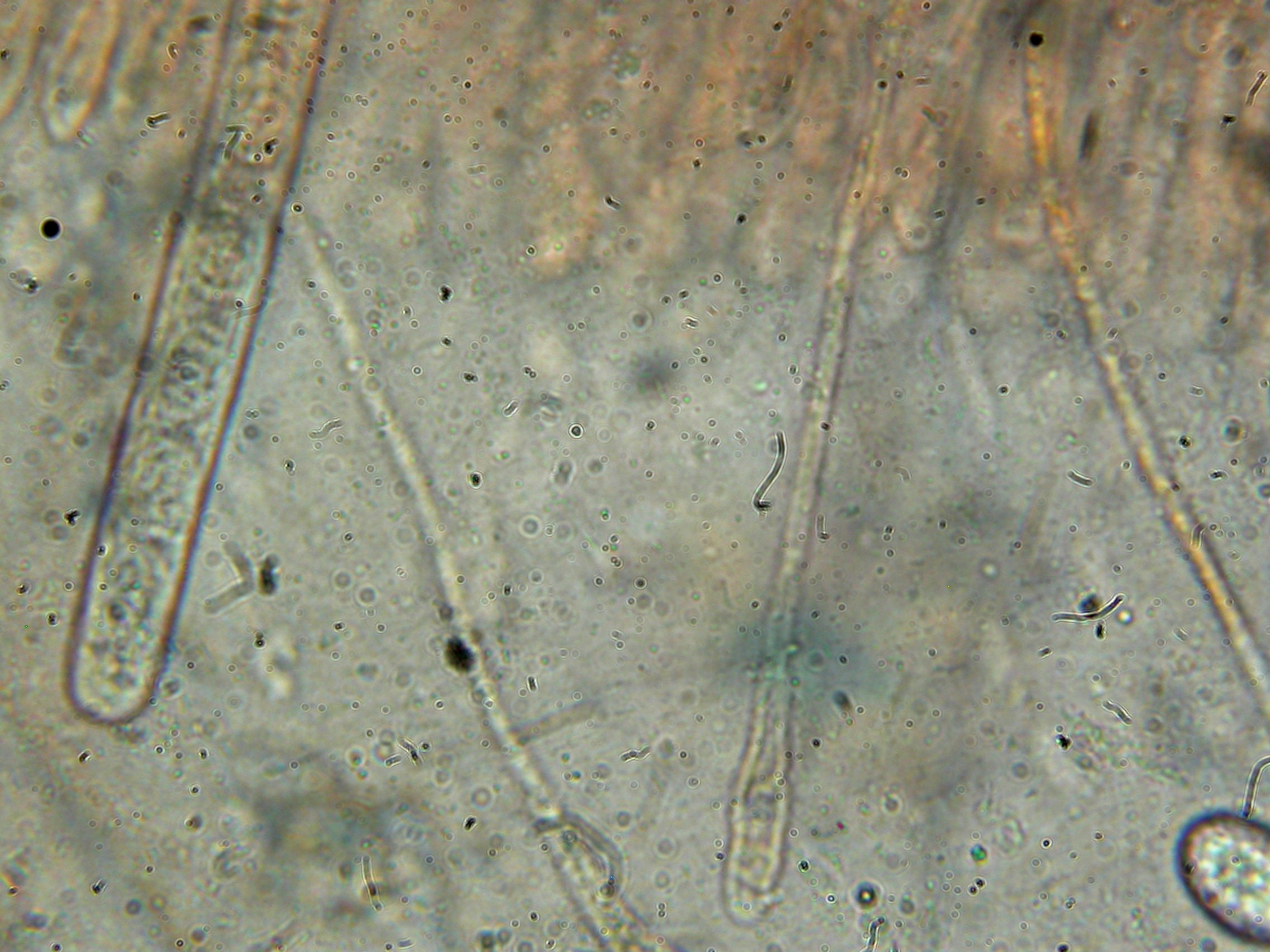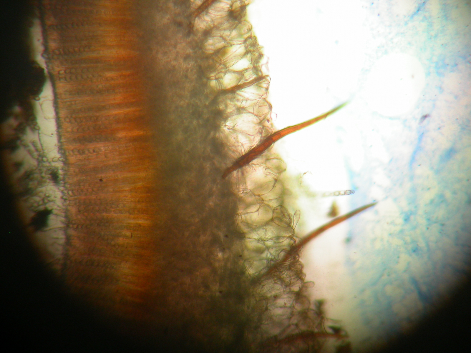 Das Gleiche gilt für die Haare an der Außenseite des Apothecium, von unterhalb des Randes bis zur Wurzel. Hier ermittelt man von-bis Werte und achtet darauf, ob diese Haare heller sind als die Randhaare. Ansonsten das gleiche Prozedere wie bei den Randhaaren.