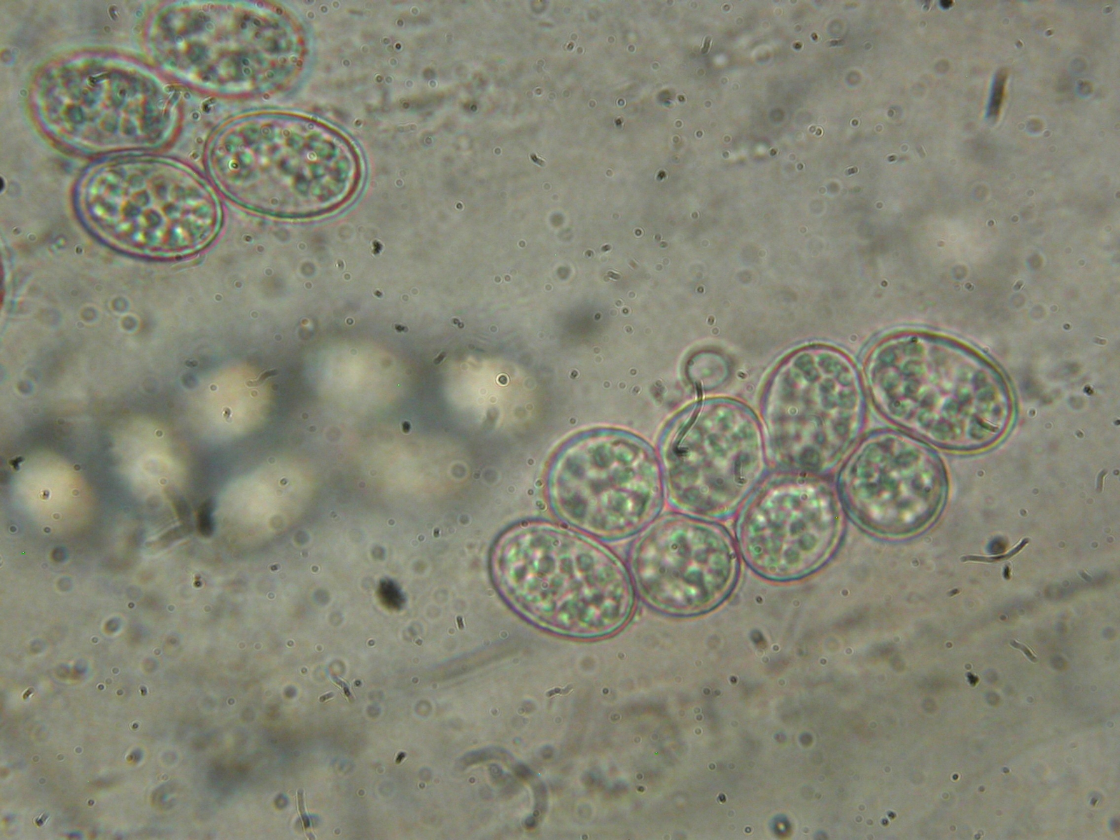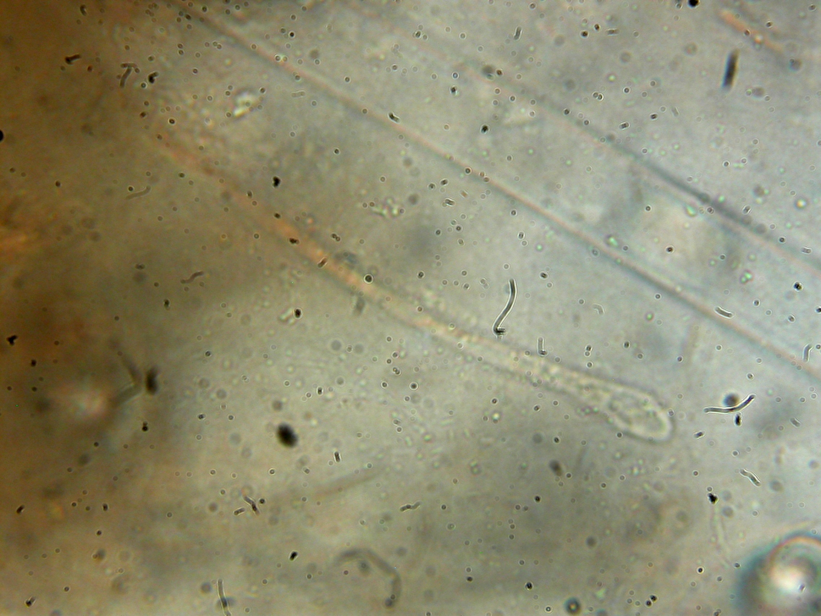 vorab, Scutellinia sind eine recht knifflige Gattung. Makroskopisch geht da gar nichts, und nach mikroskopischen Fotos bestimmen ist schwierig oder oft ebenso unmöglich. Sehr oft geht die Bestimmung nur über Merkmalskombiantionen mehrerer!!! untersuchter Exemplare, manchmal auch überhaupt nicht. Es ist eine Gattung, an der man dranbleiben muss, d.h. immer wieder untersuchen und bestimmen was einem an diesen hübschen Becherchen in die Hände fällt. Und ohne die Hilfe sehr erfahrener Kollegen geht immer noch so mancher Schuß in den Ofen. Was also muss man tun, um eine Art zu bestimmen?Als erstes macht man ein Sporenabwurfpräparat nur in Wasser um die Größe reifer Sporen zu ermitteln.