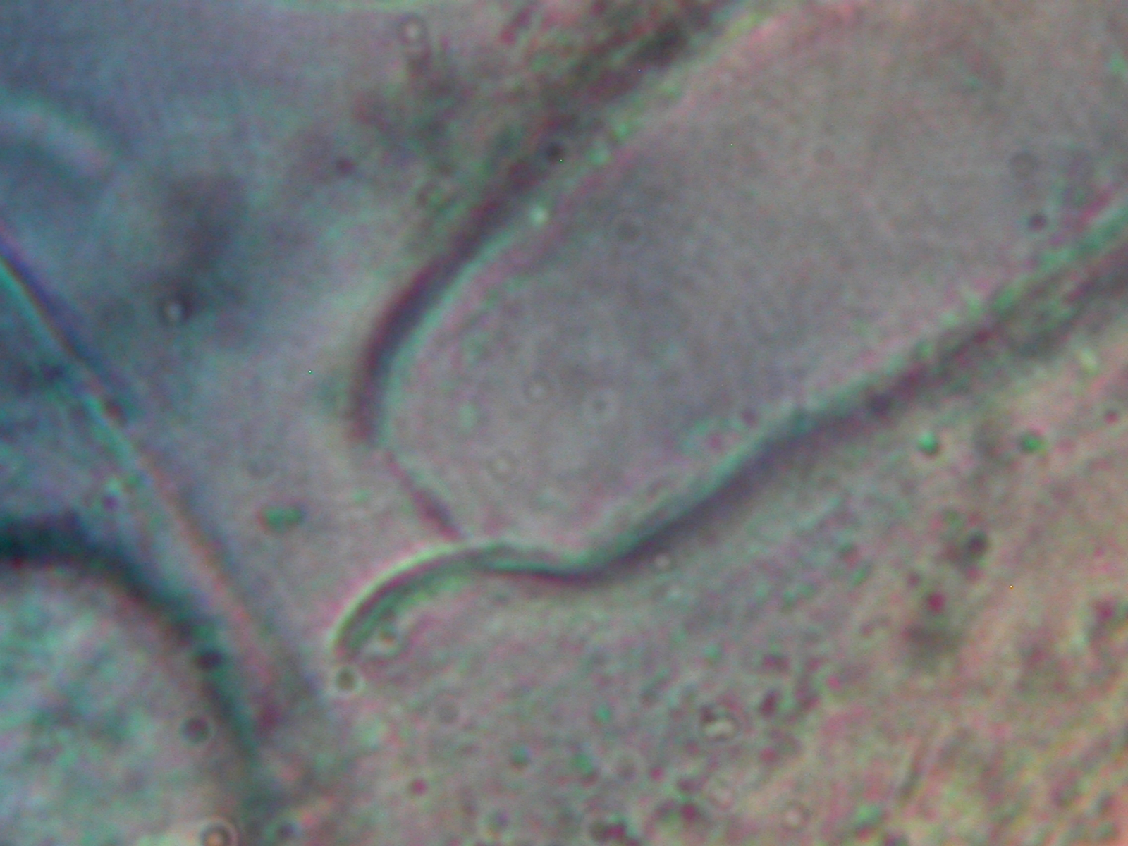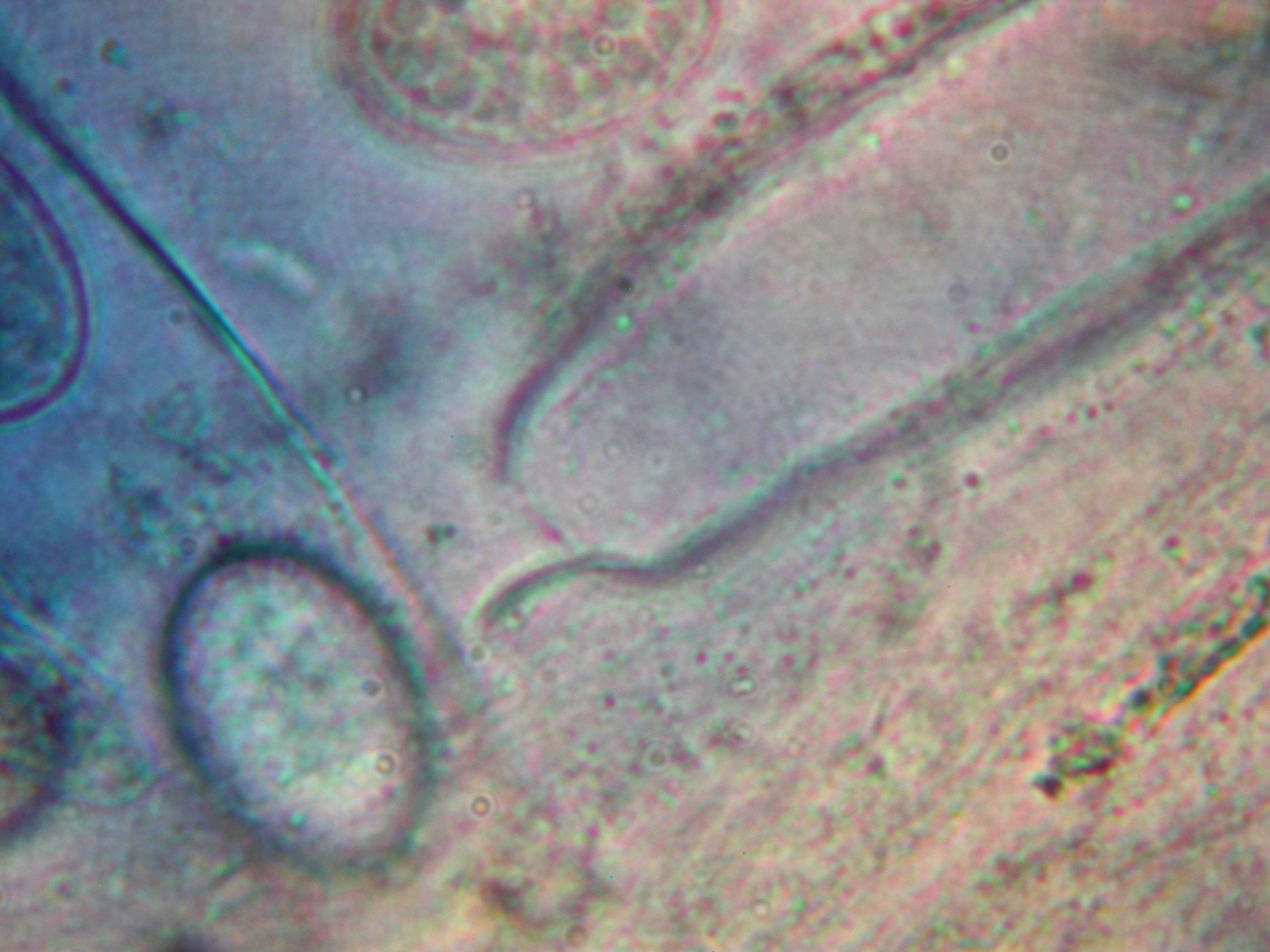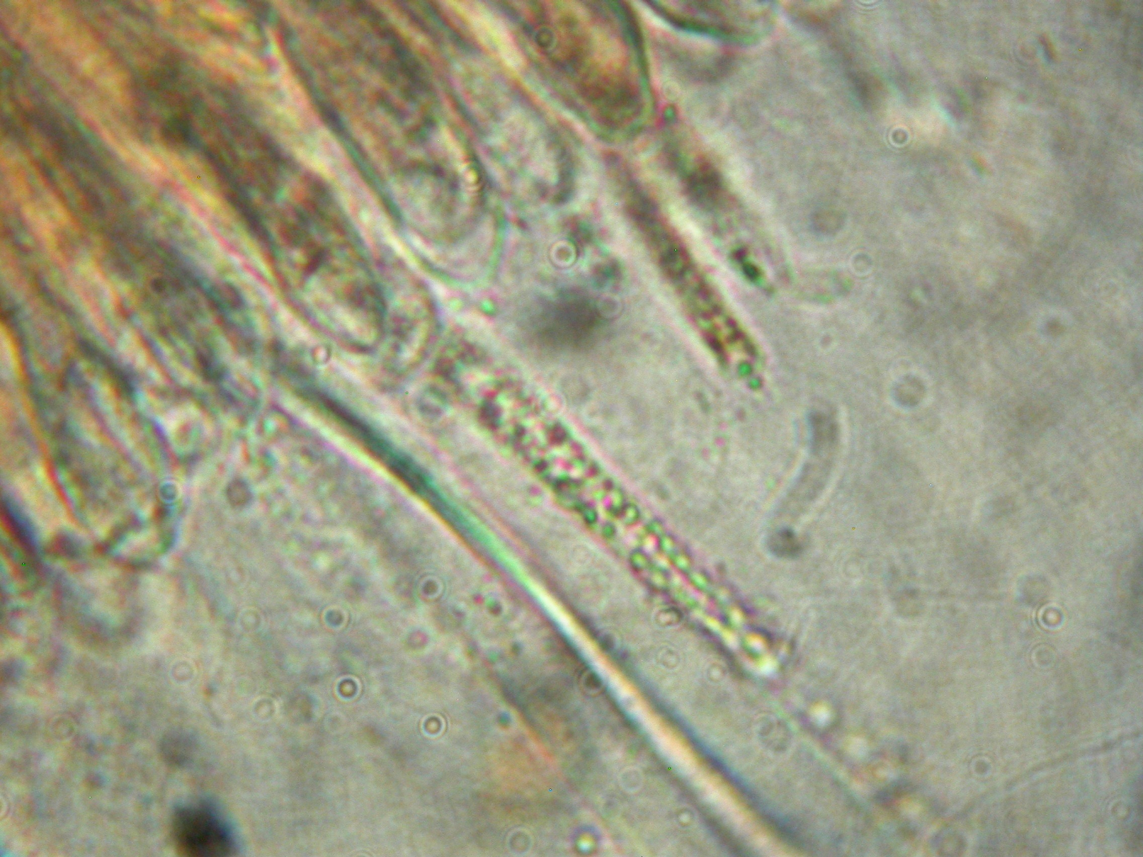 14.Das links sieht für mich aus wie ein aus der Fruchtschicht rausgepresster Ascus. Dann nach rechts gehend, wieder zwei Paraphysen und ganz rechts außen sieht für mich wieder aus wie eine mit Kristallen besetzte Paraphyse? Kann es so etwas geben?