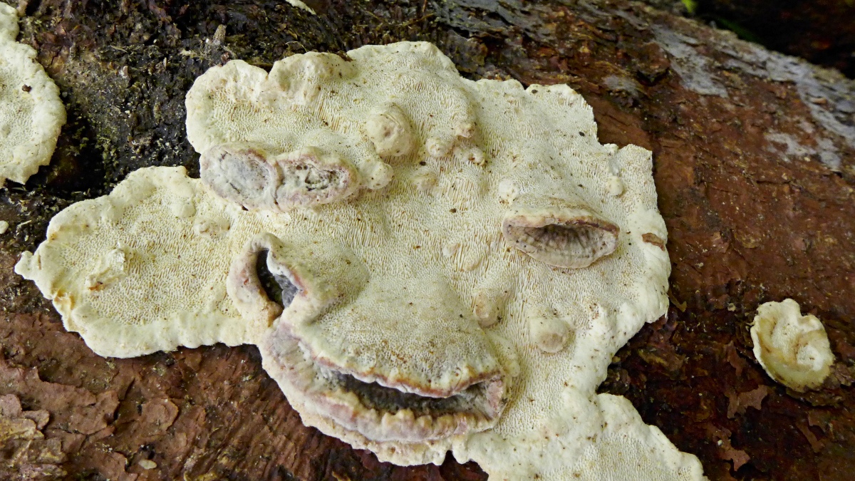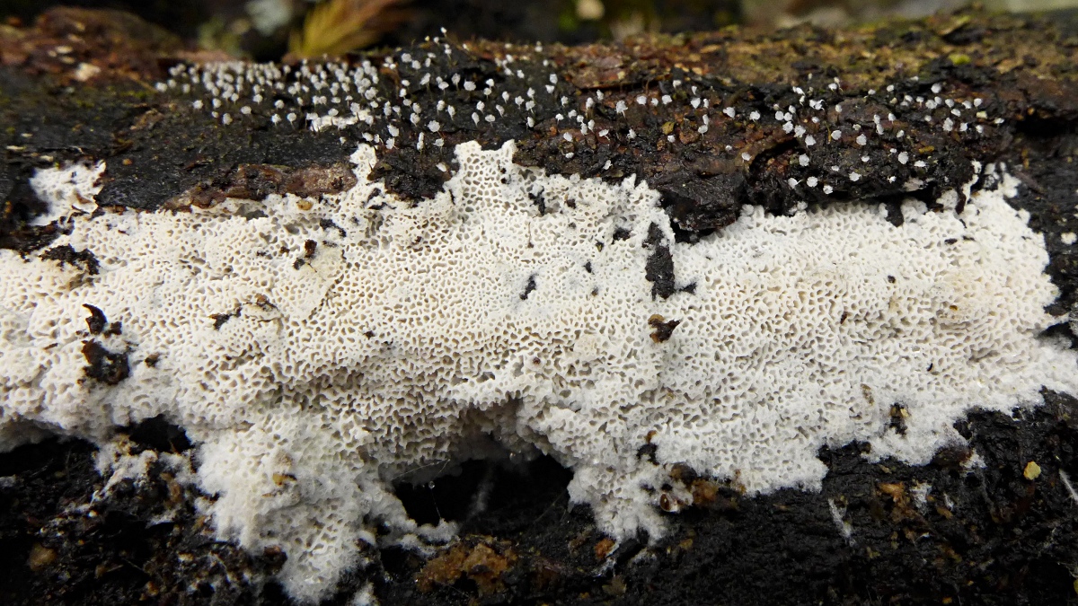 An diesem morschen Holz entwickelte sich dieser relativ grobporige rein-weiße Pilz (Poren nicht gemessen, aber mehr als 1 pro mm, unregelmäßig, Gesamtlänge des Belags einige Zentimeter).
