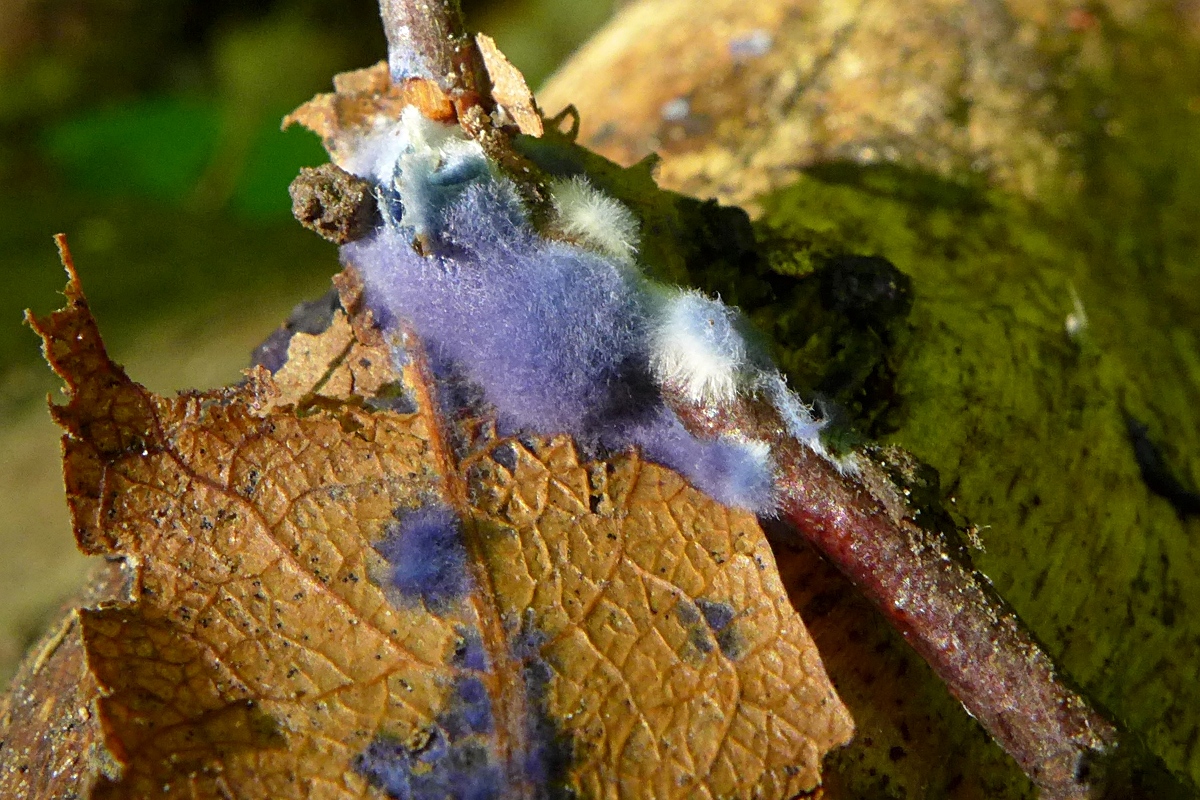 Nochmals 14 Tage später waren auf der Unterseite des Astes Blätter und Zweigansätze mit bläulichem Myzelgeflecht bewachsen.