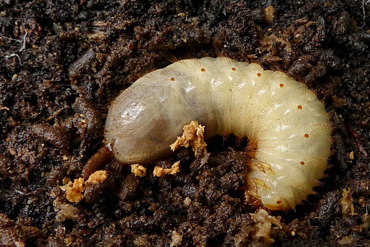 Käferlarve von (wahrscheinlich) dem Gemeinen Rosenkäfer, cf. Cetonia aurata, nagte sich durch dickeres morsches Holz.