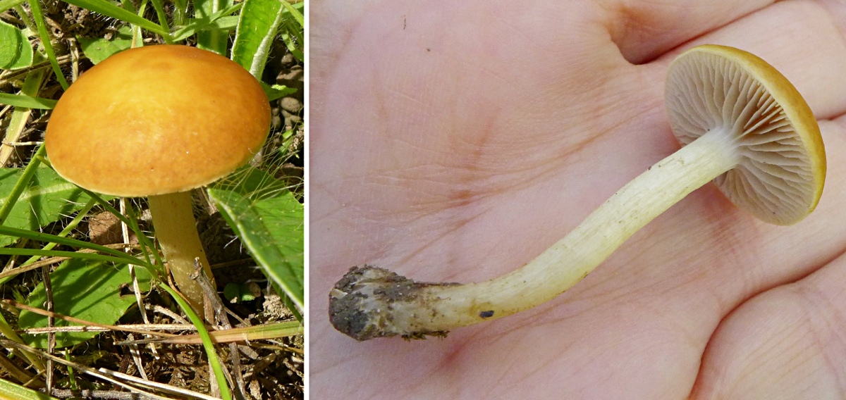 2 kleine Pilze, 13 und 17 mm Hut, Stiel 2 mm dick und 25-45 mm lang ohne Ring, kleine abstehende Fasern, Stiel auch schon hohl, unten leicht verdickt, mit Mycel, Velumreste an Hut oder Stiel nicht erkennbar,