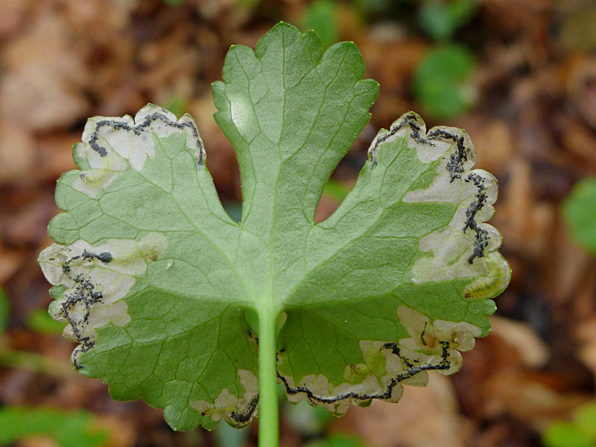Hier Miniergänge von Phytomyza spec. - einer Minierfliegenart (mit Maden und "Kötteln") an den unteren Blättern (der inzwischen verblühten) Hahnenfußpflanzen im Wald.