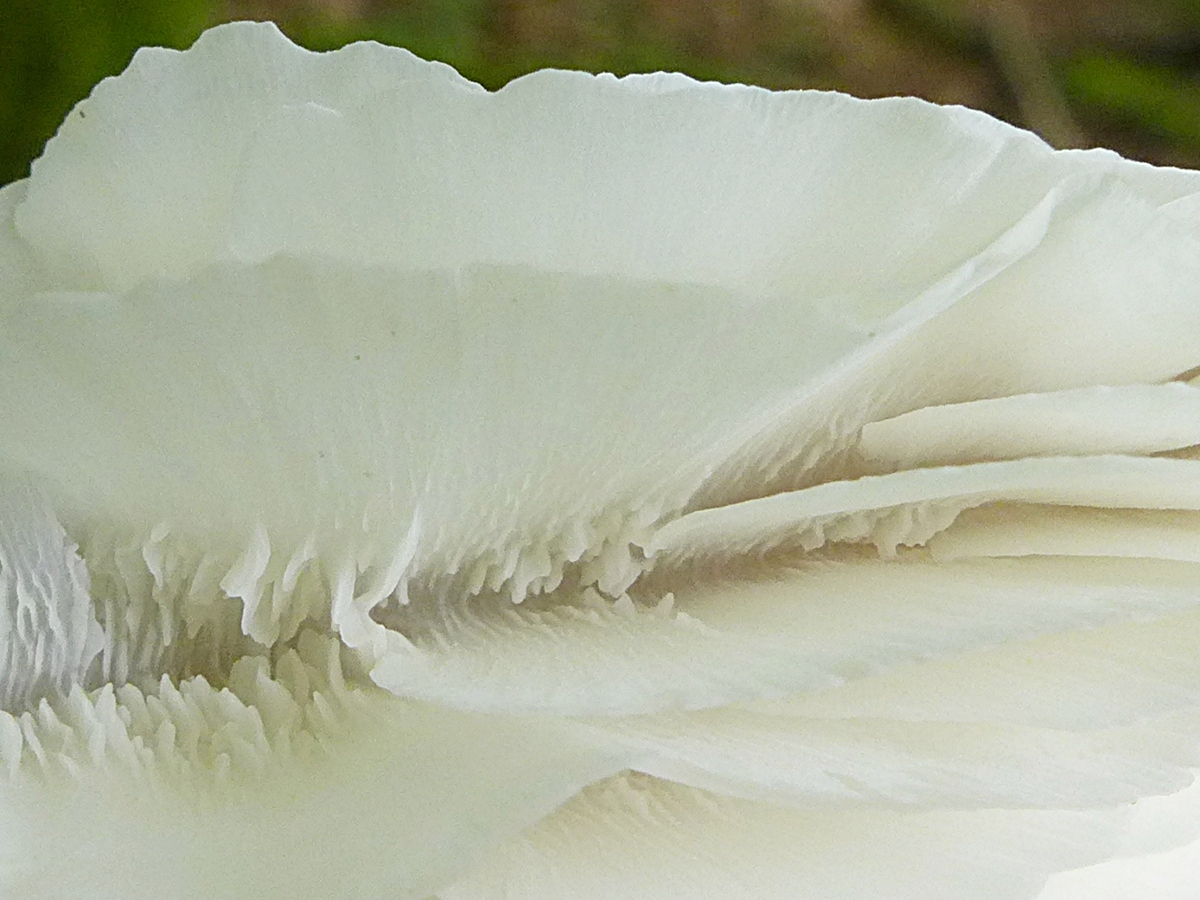 super-schöne weiße frische Lamellen von einem noch frischen Breitblatt, Megacollybia platyphylla.